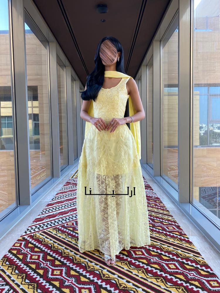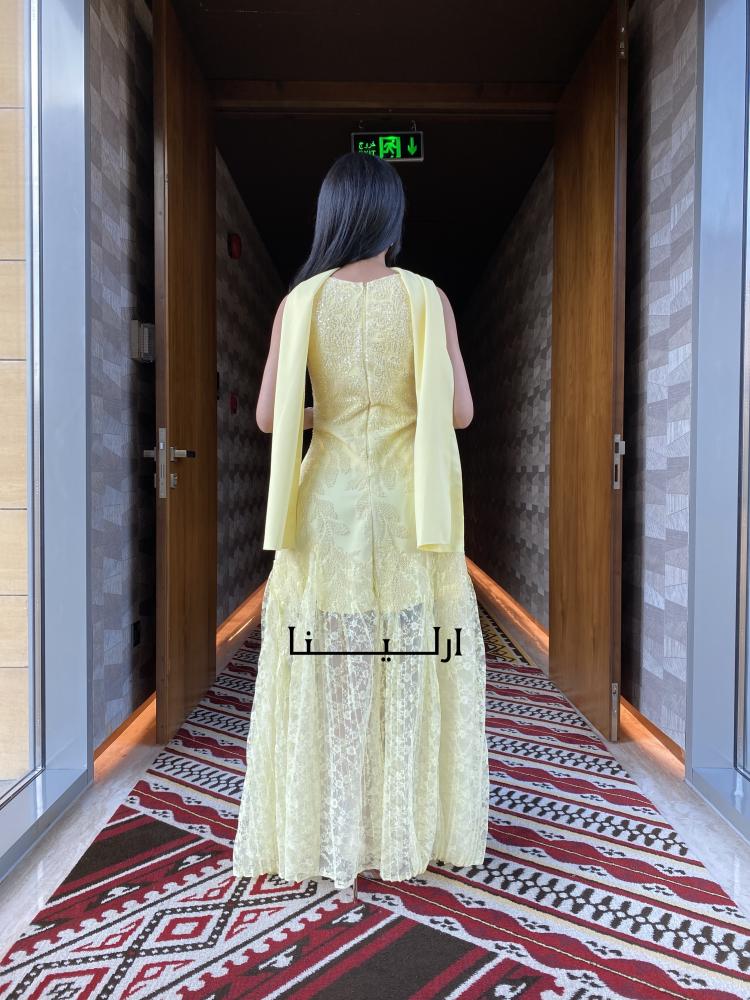 - الخامة والتزيين: فستان سهرة ناعم من الدانتيل المطرز بشك فاخر، ولون ليموني منعش يمنحك طلة مشرقة تنبض بالرقة والجاذبية.