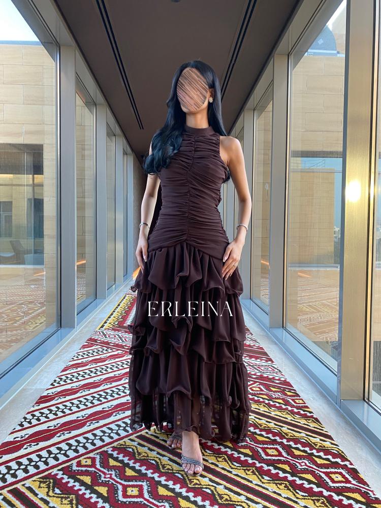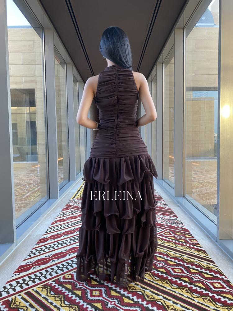 - الخامة واللون: فستان بني غامق منسوج من شيفون الجورجيت الفاخر بلون بني عميق يعكس جمال لون بشرتك بكل أناقة.