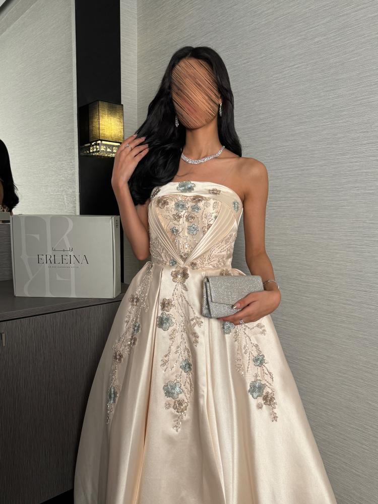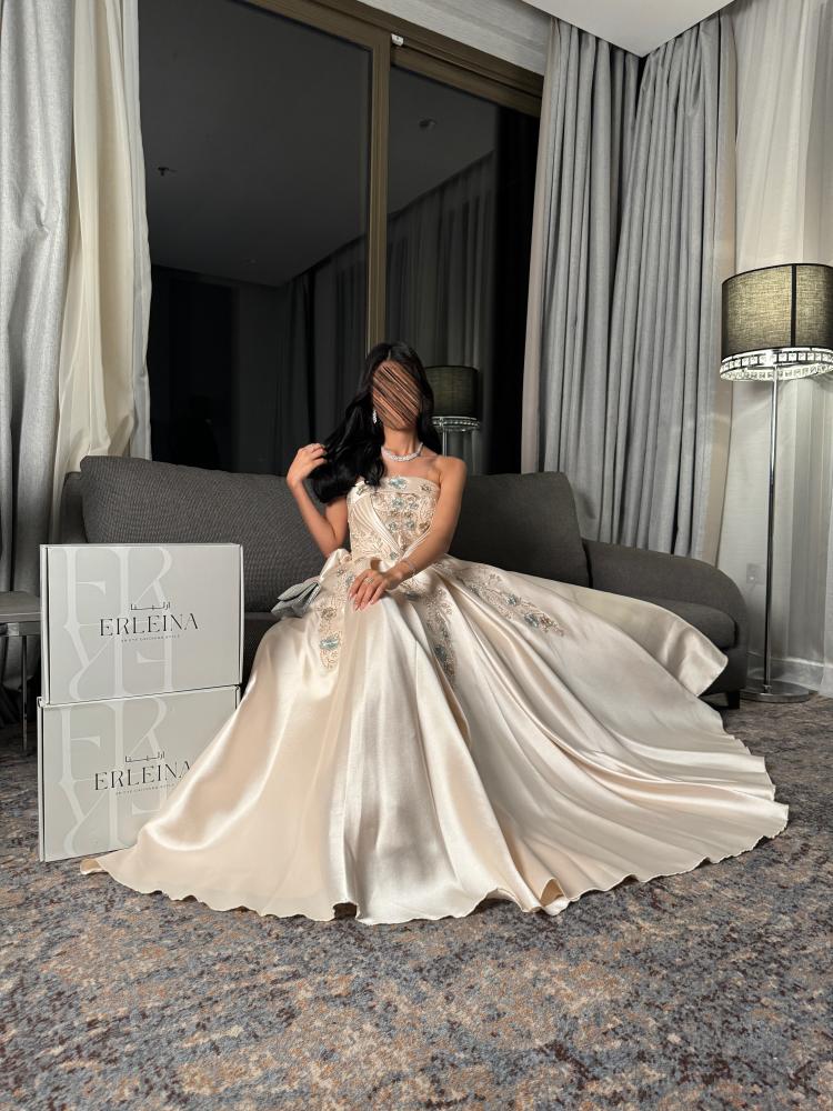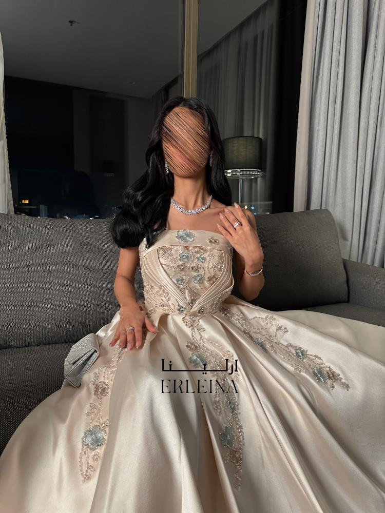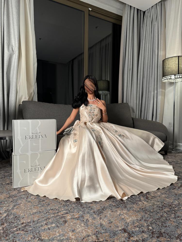 امنحي نفسك إطلالة تحاكي الجمال الملكي مع هذا الفستان الساحر بلونه البيج الفاتح الذي يجمع بين الفخامة والأنوثة.