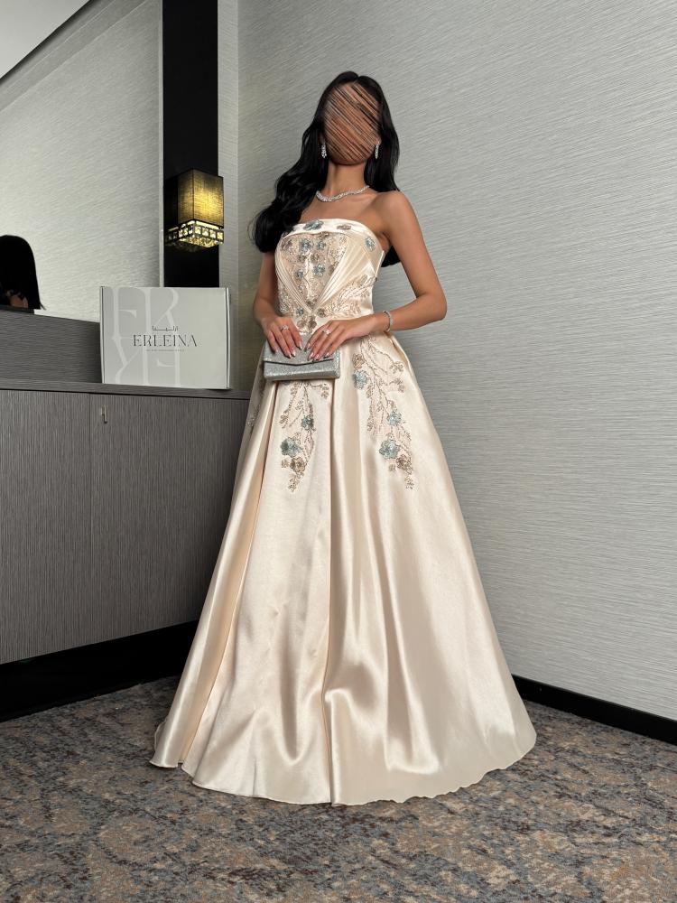 فستان سهرة بيج أنيق بتطريز فاخر لإطلالة تشع جمالًا
