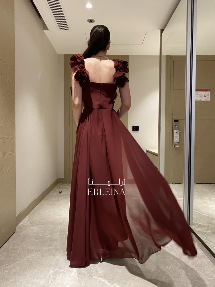 - الخامة واللون: فستان سهرة فخم من التفته الاسترتش الراقي والشيفون الفاخر بلون عودي عميق يمنح البشرة إشراقة آسرة.