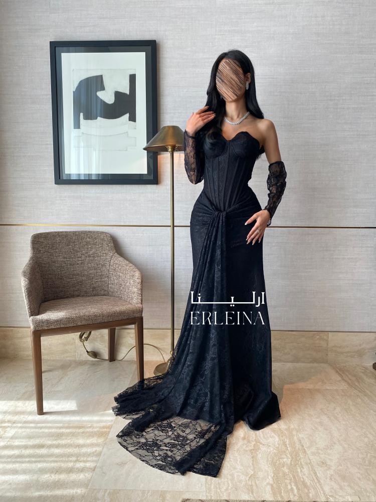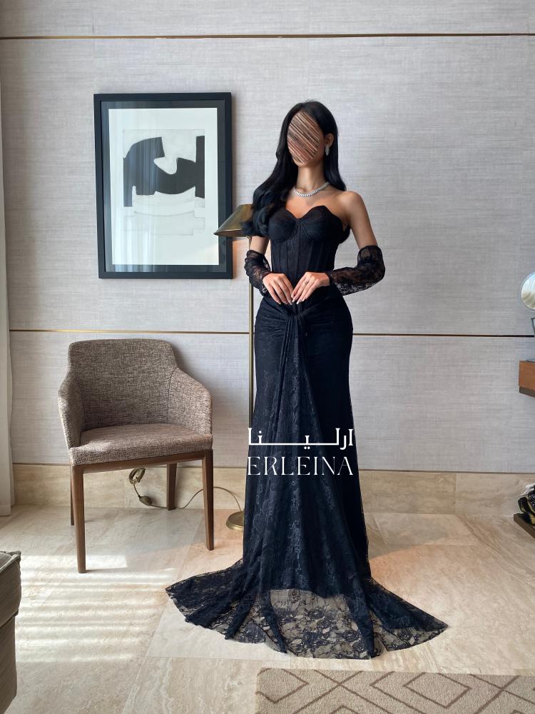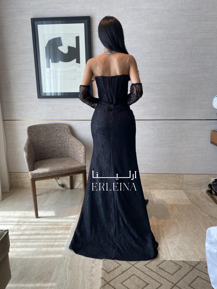• الخامة واللون: فستان أسود سهرة أنيق منسوج من الدانتيل الراقي، بلون ملكي ساحر يعكس رونق بشرتك.