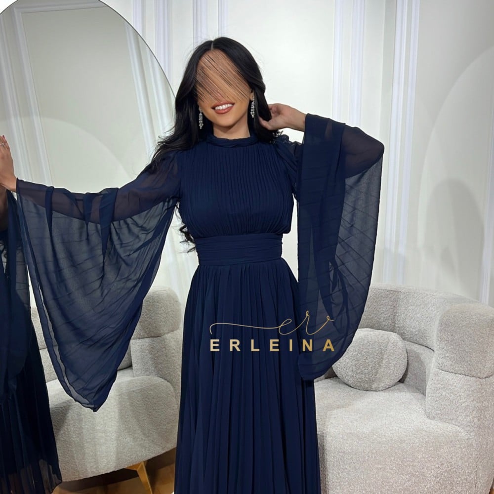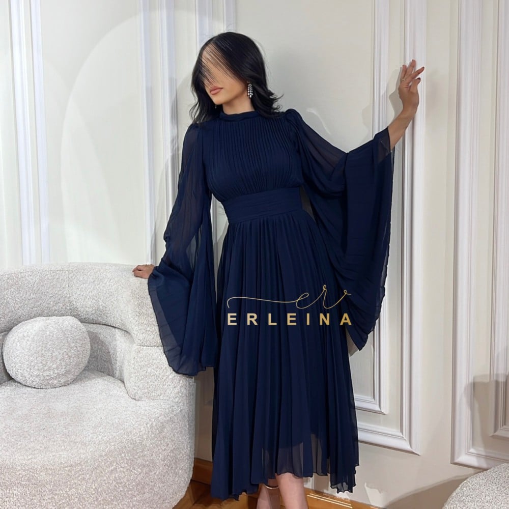 - فستان شيفون طويل بقصة عنق عالية وأكمام طويلة وواسعة قطعة باردة ومميزة.