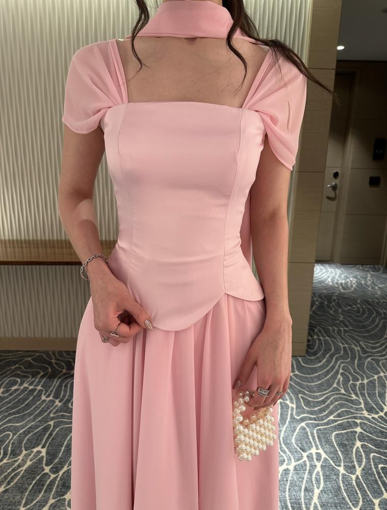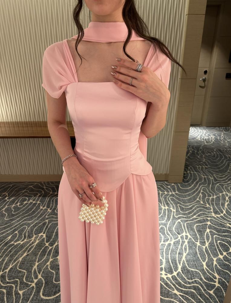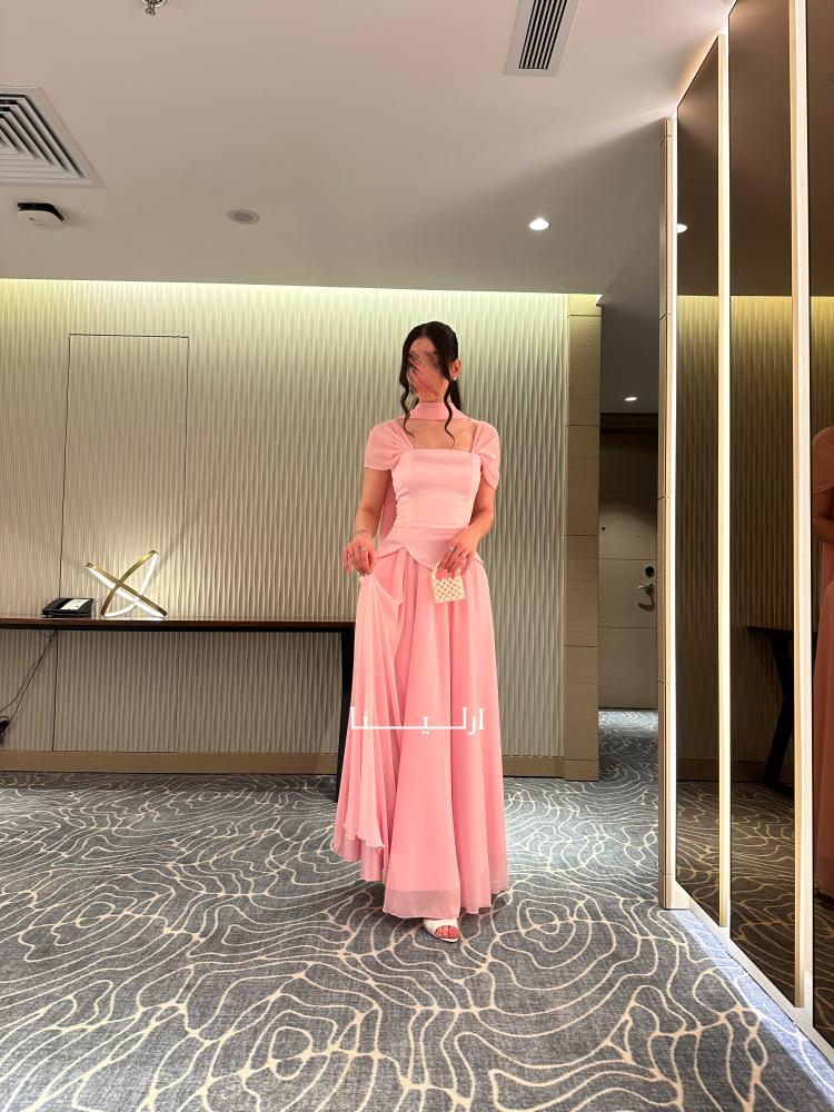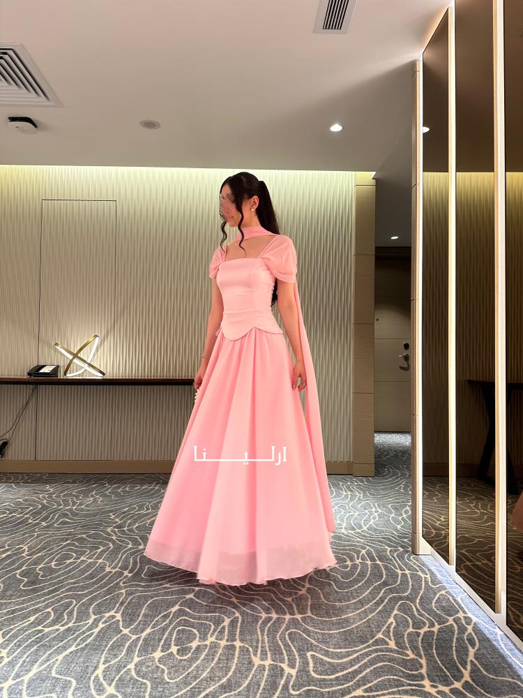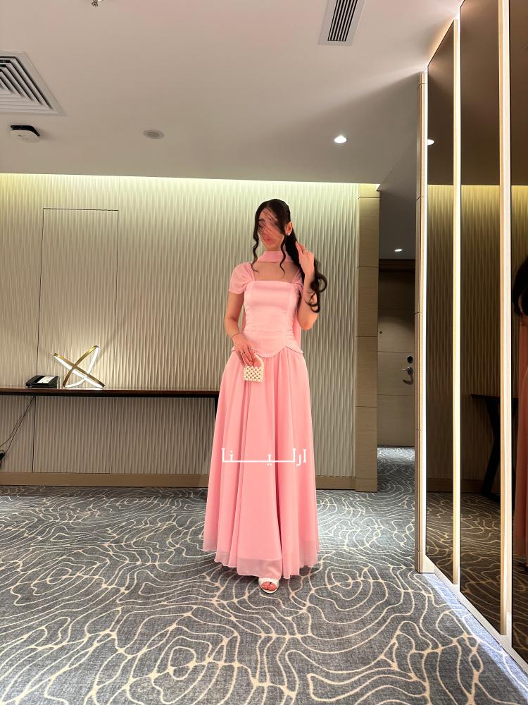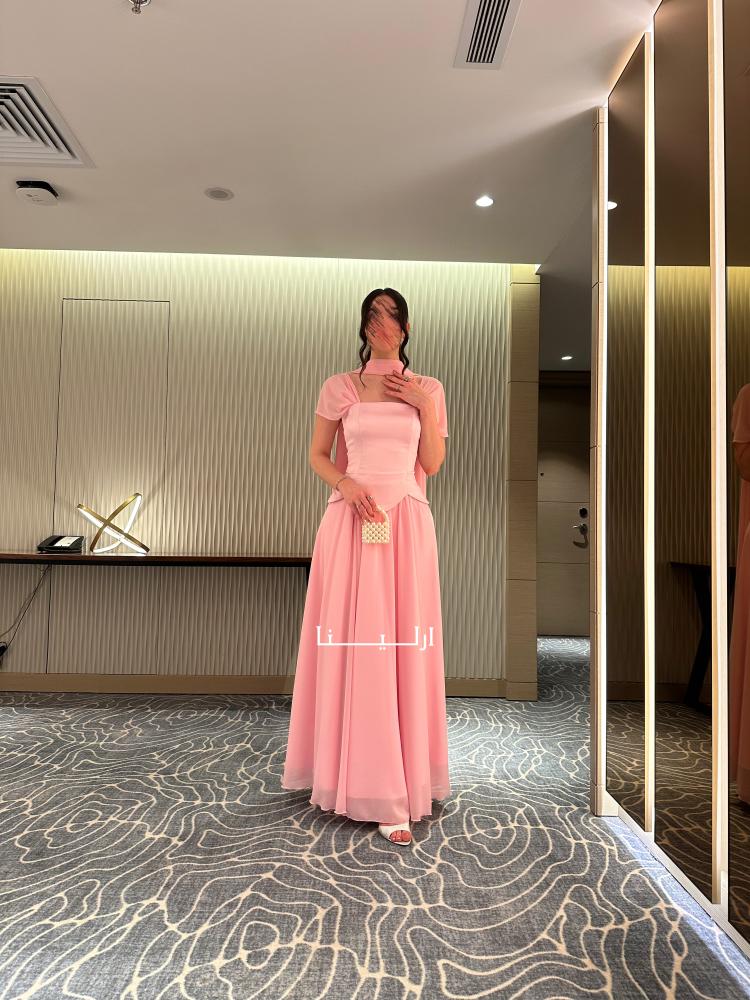 - الخامة واللون: فستان بينك فاتح منسوج بعناية من التفته الساحر والشيفون الرقيق ليمنحك إطلالة أنثوية حالمة تشع بالأناقة.