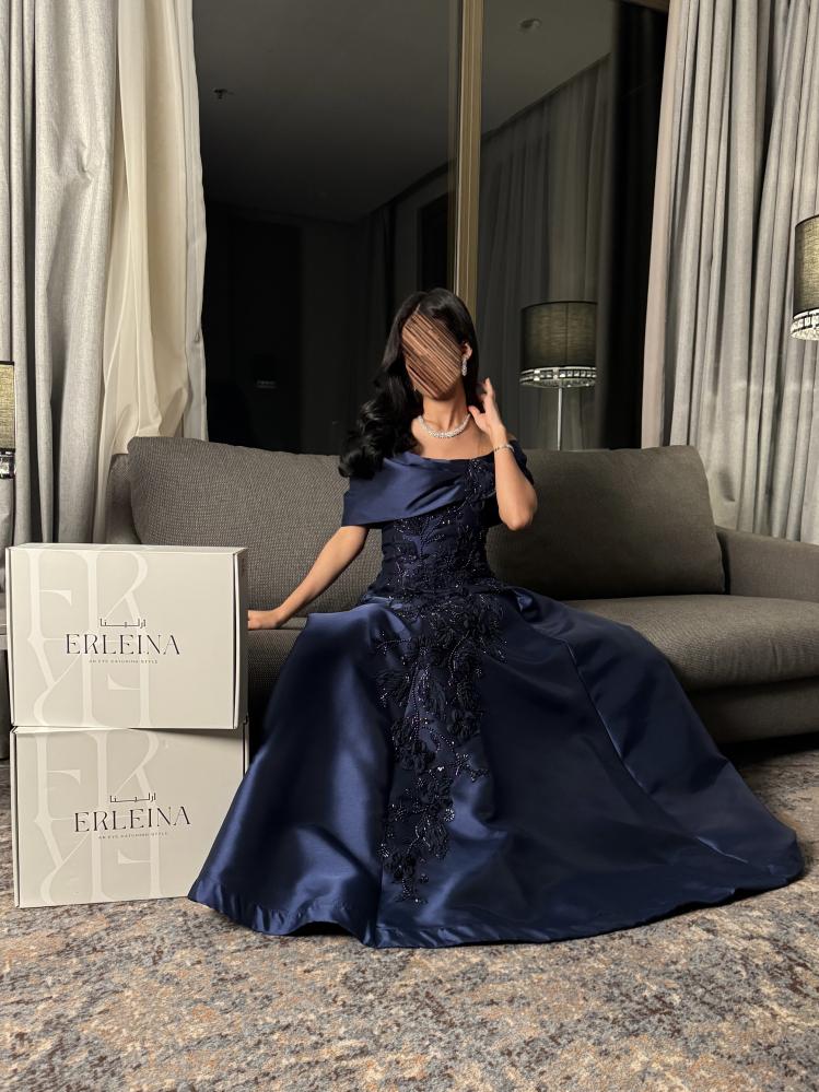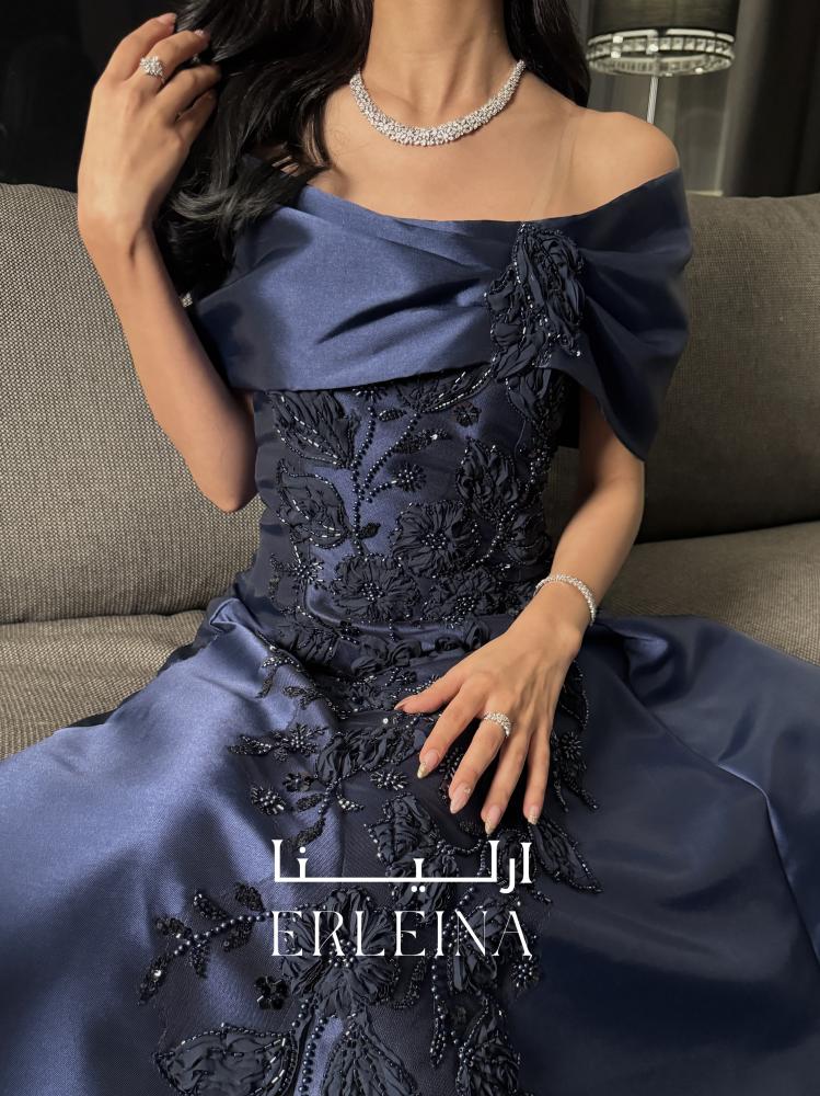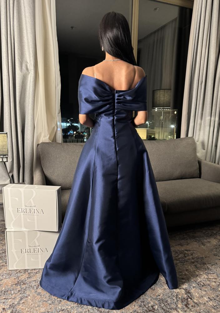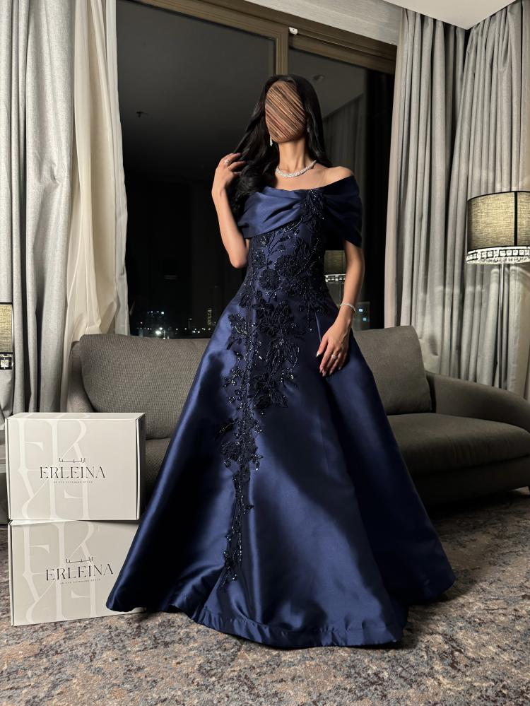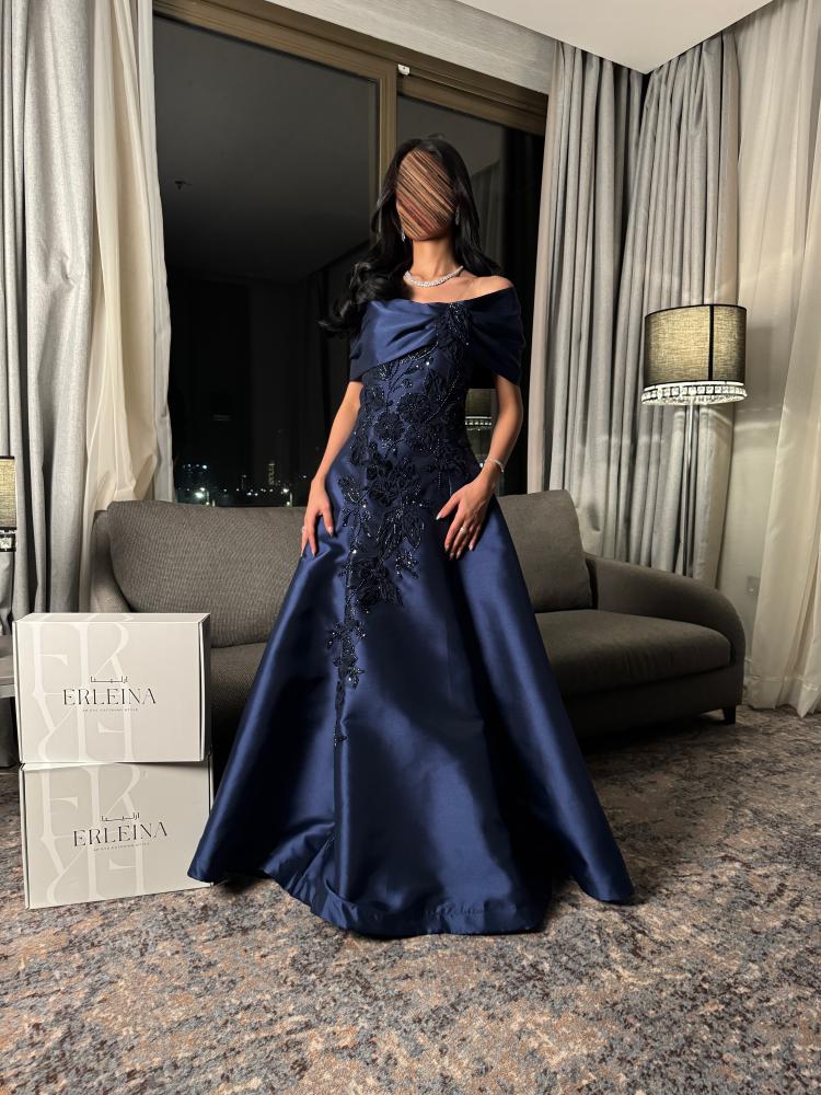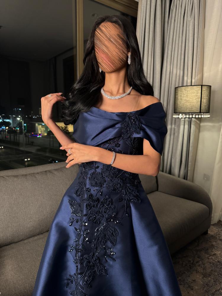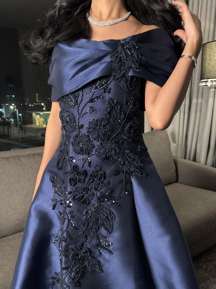 فستان كحلي ملكي من قماش ميكادو بتصميم أوف شولدر وتطريز فاخر