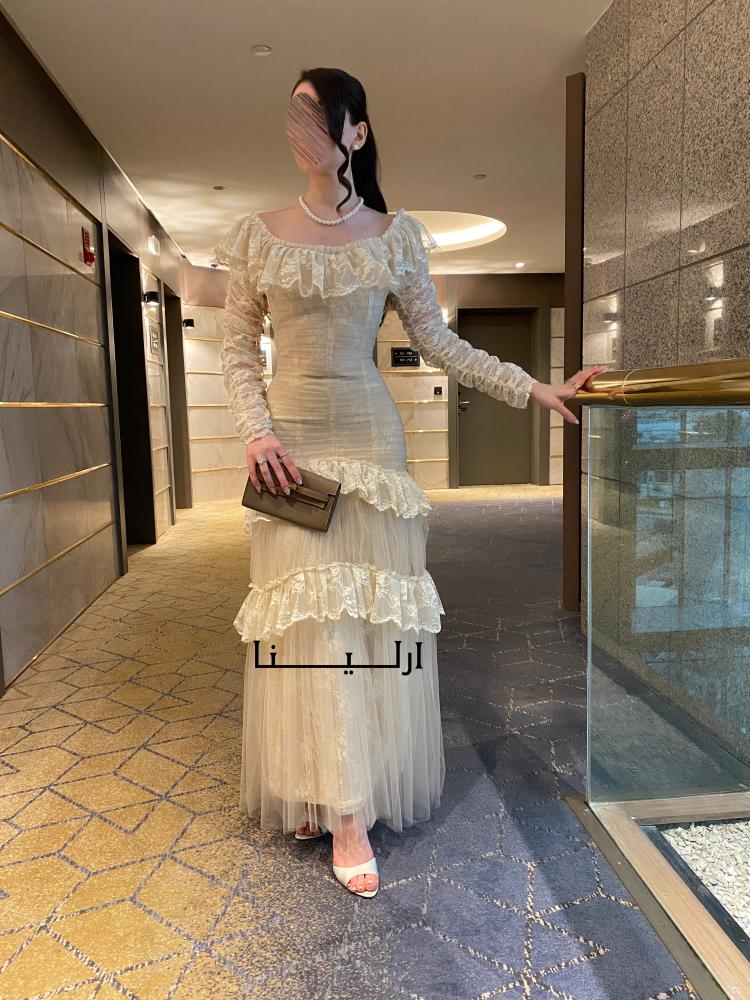 - الخامة واللون: فستان أوف وايت منسوج من التل الراقي ومزين بالدانتيل الأنيق ومبطن بالباربي الفاخر لطلة أنثوية مكتملة التفاصيل.