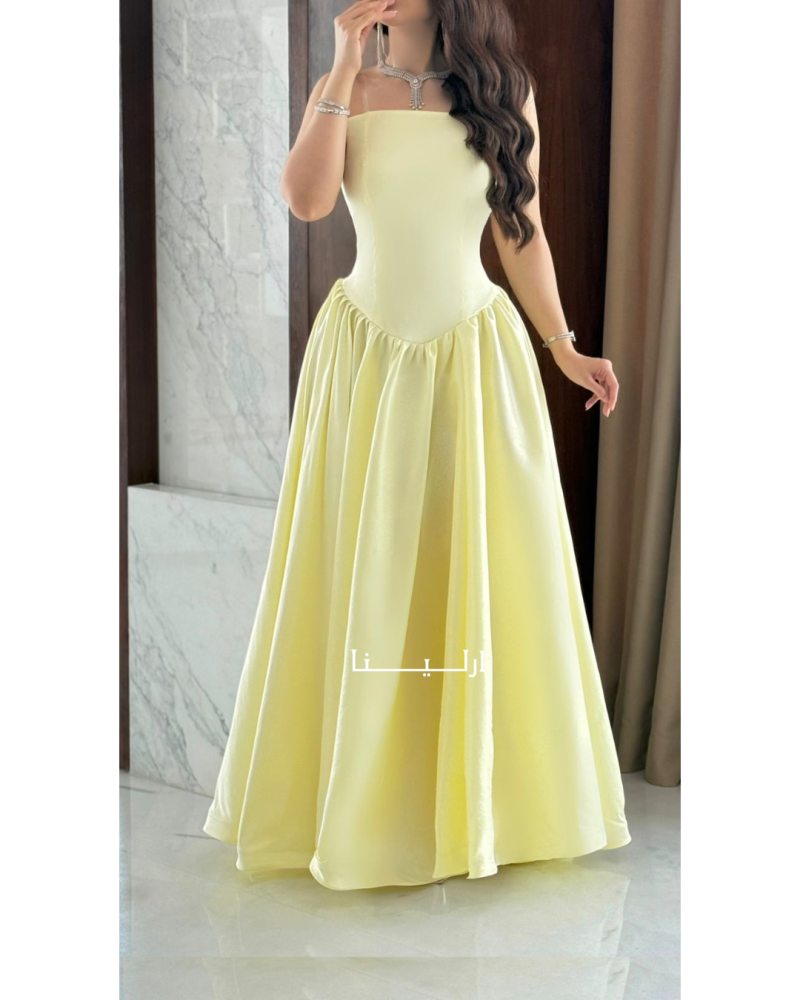 - فستان سهرة أصفر حالم منسوج من الشانطون الفاخر، يعكس إشراقة بشرتك ويمنحك طلة مشرقة ملائمة لفصل الصيف أو الربيع.