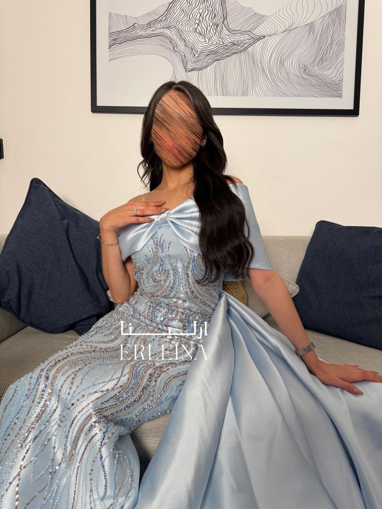 فستان سهره باللون السماوي الناعم بتفاصيل ملكية تجمع بين الرقي والأنوثة. يتميز بتصميم ضيق يبرز جمال القوام مع ذيل فاخر طويل يمنحك حضورًا مبهرًا. الأكمام المنسدلة تنسدل برقة فوق الكتفين لتُضفي لمسة من الفخامة الملكية، بينما التطريز البراق بتفاصيله المذهلة يعكس الضوء بكل زواياه ليمنحك إطلالة متوهجة لا تُنسى. خامة الفستان فاخرة ومريحة، تنساب على الجسم بخفة وثبات.