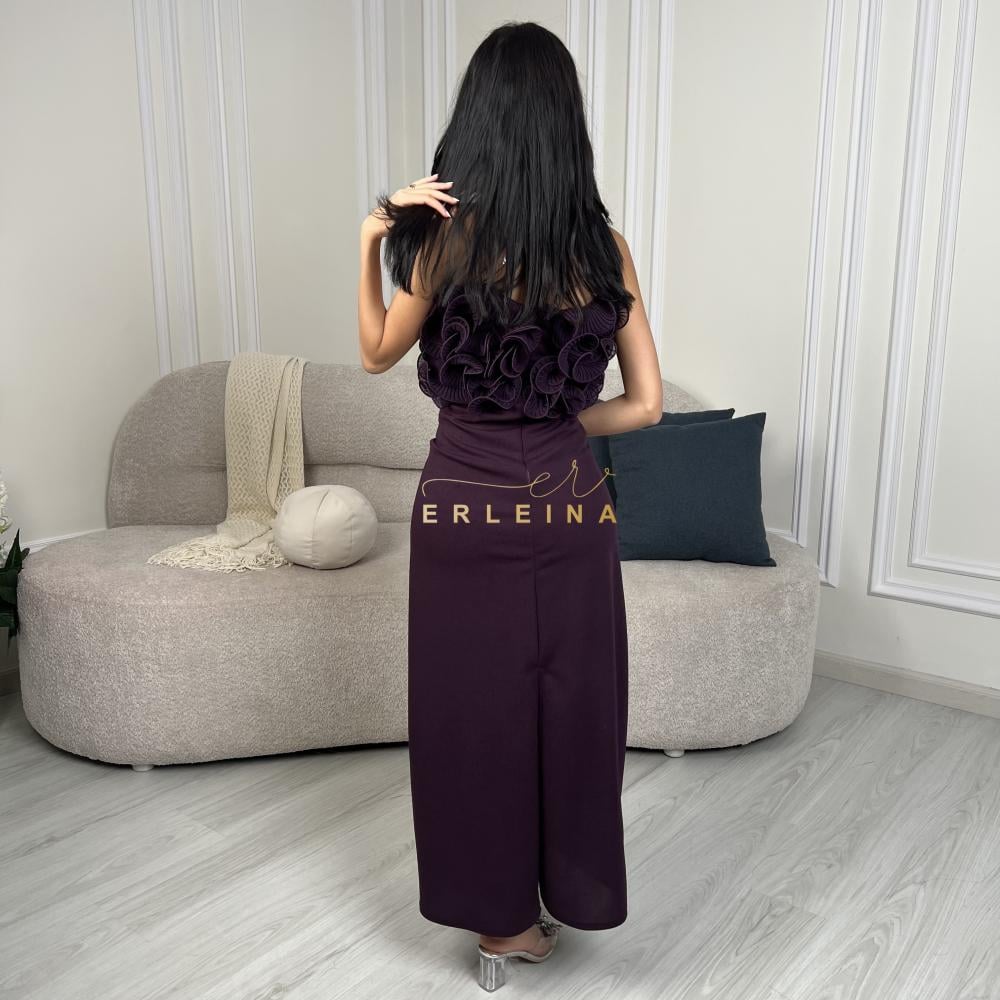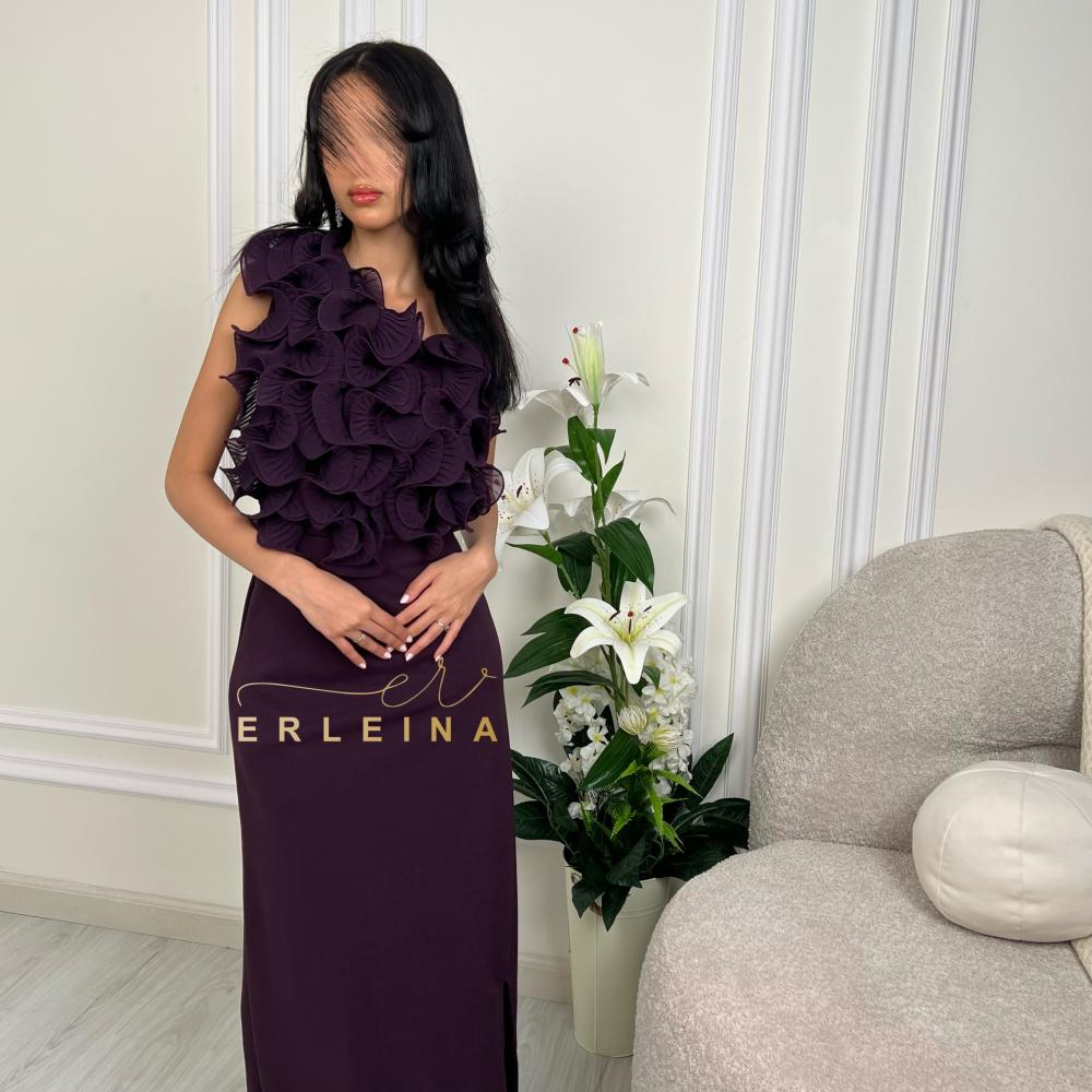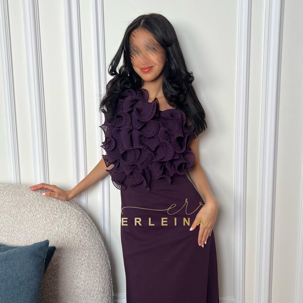 - فستان سهرة موف بكم واحد يبرز نعومة الكتف وجماله، بتصميم أنيق على الصدر مستوحى من نعومة الورود.