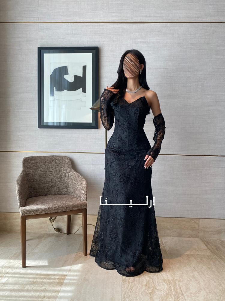 • الخامة والزينة: فستان سهرة أسود منسوج من الدانتيل الراقي بفصوص لامعة تمنح التصميم بريقًا أنيقًا لطلة لا تُنسى.