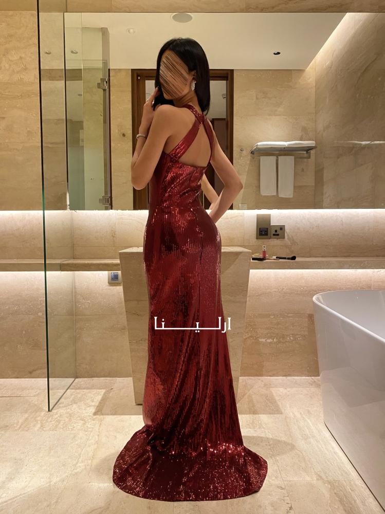 - الخامة واللون: فستان فخم طويل منسوج بالكامل من الترتر اللامع بلون عودي عميق يمنح البشرة بريقًا مميزًا.