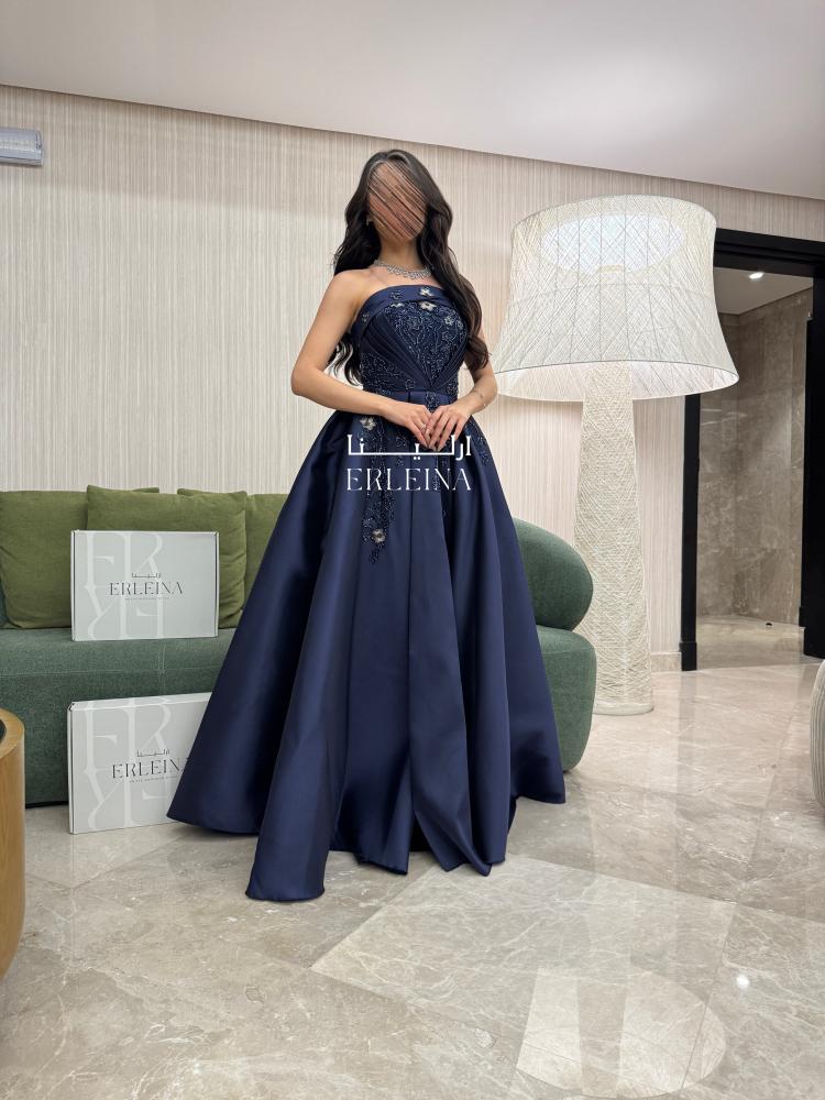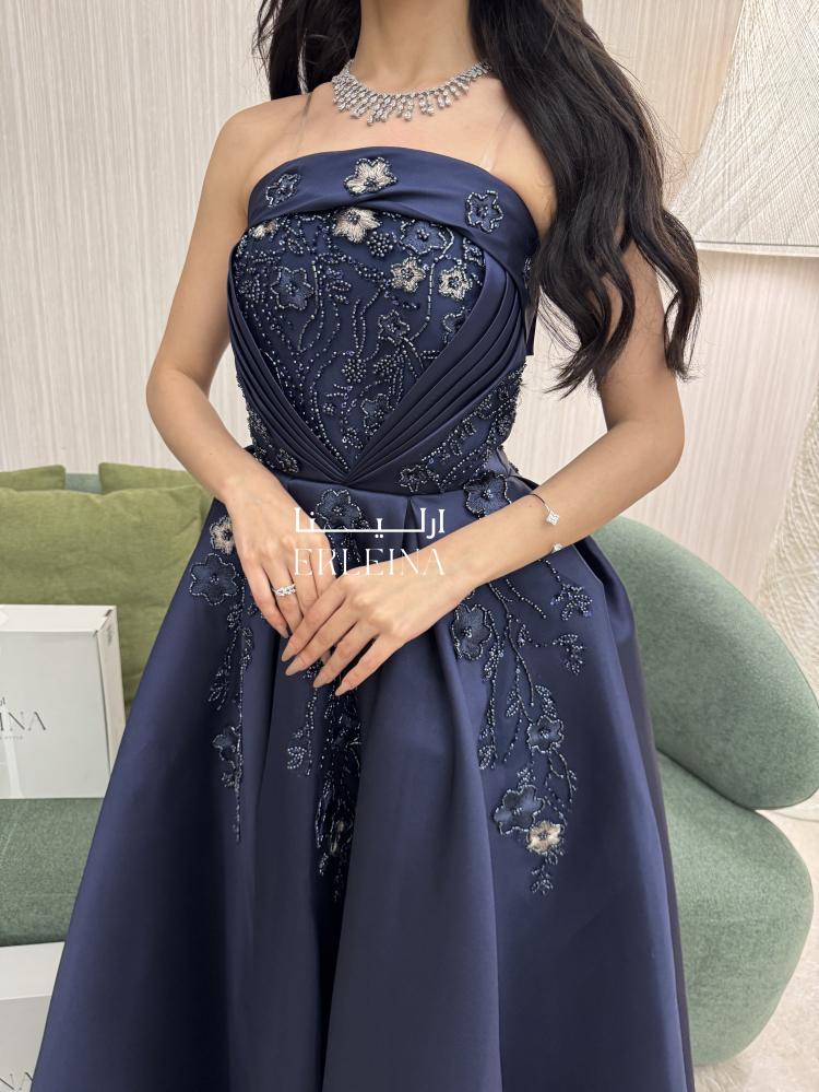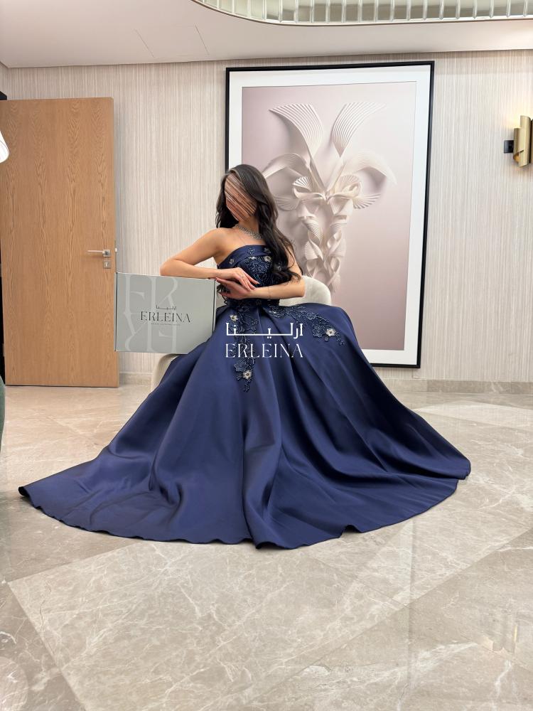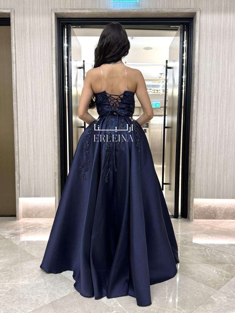 فستان سهرة كحلي راقي بتصميم أنيق وربطة خلفية جذابة