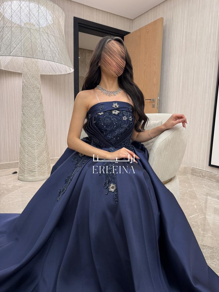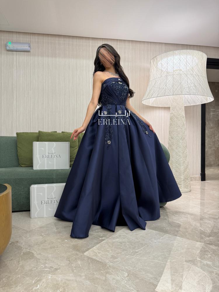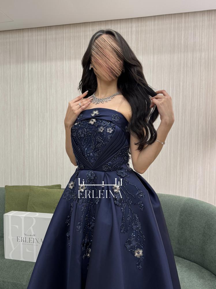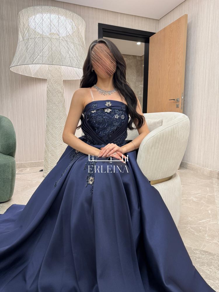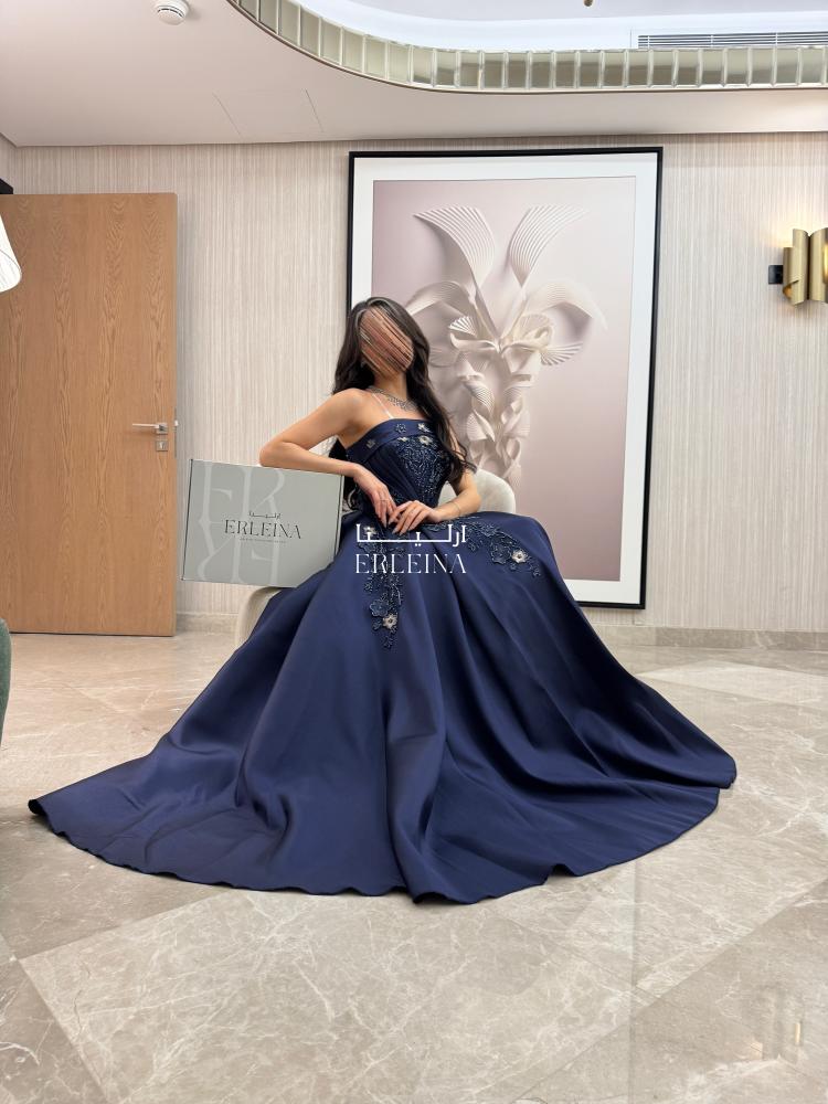 فستان سهرة كحلي راقي بتصميم أنيق وربطة خلفية جذابة