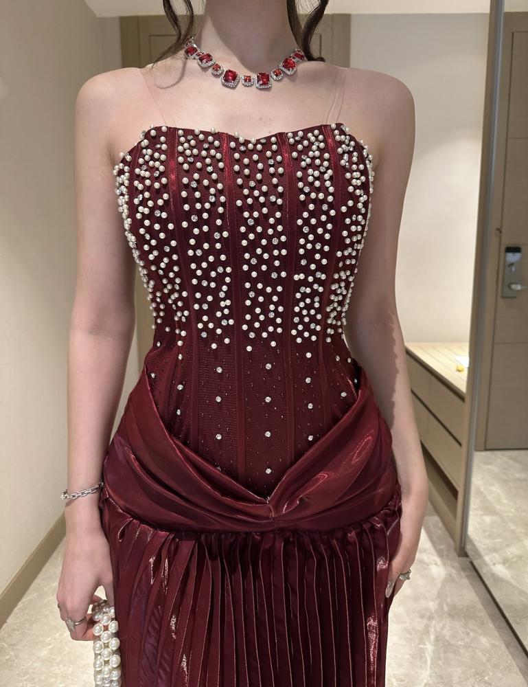 - الخامة واللون: فستان عودي غامق مزين بحبات اللؤلؤ ومنسوج من قماش الأورنجزا الأنيق، والباربي الراقي بلون عميق يعكس إشراقة صحية على بشرتك.