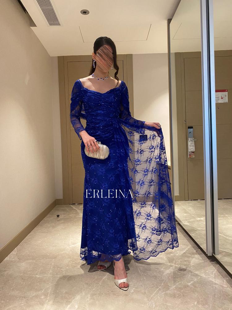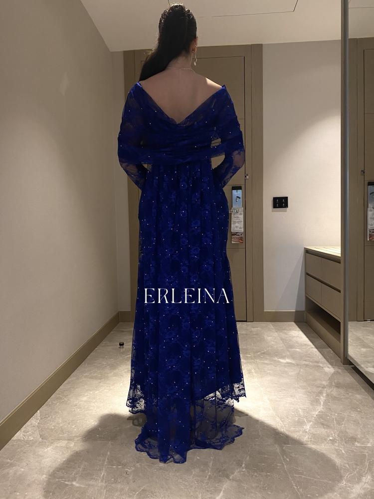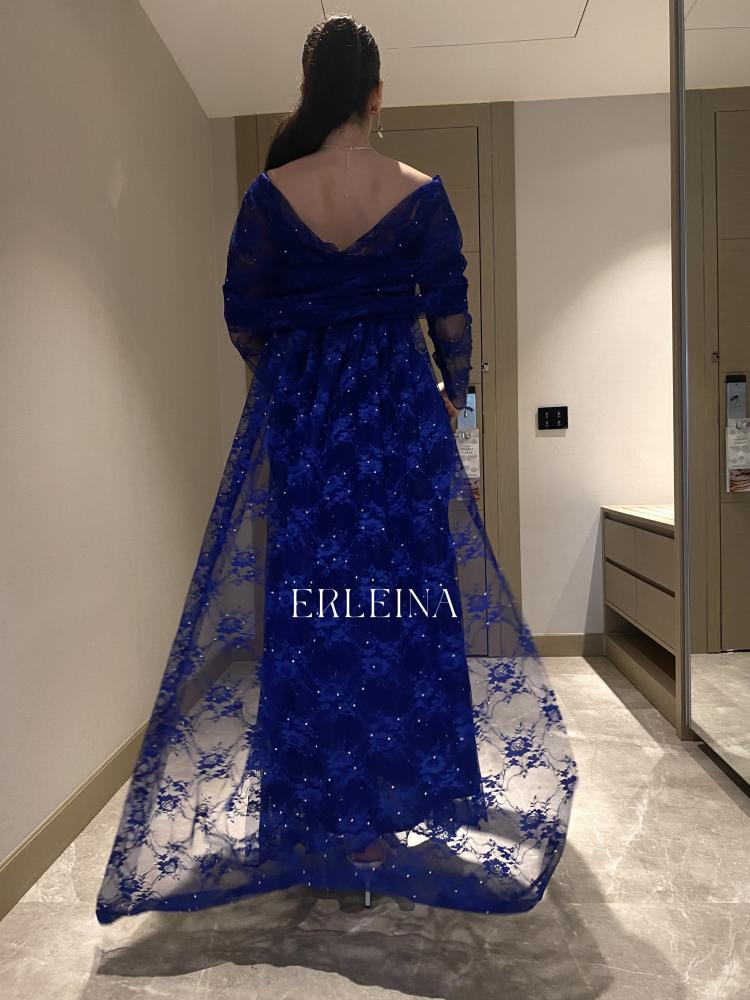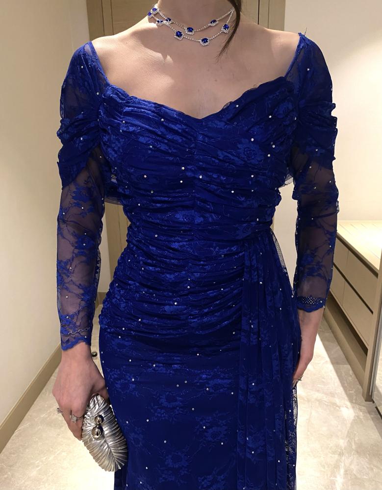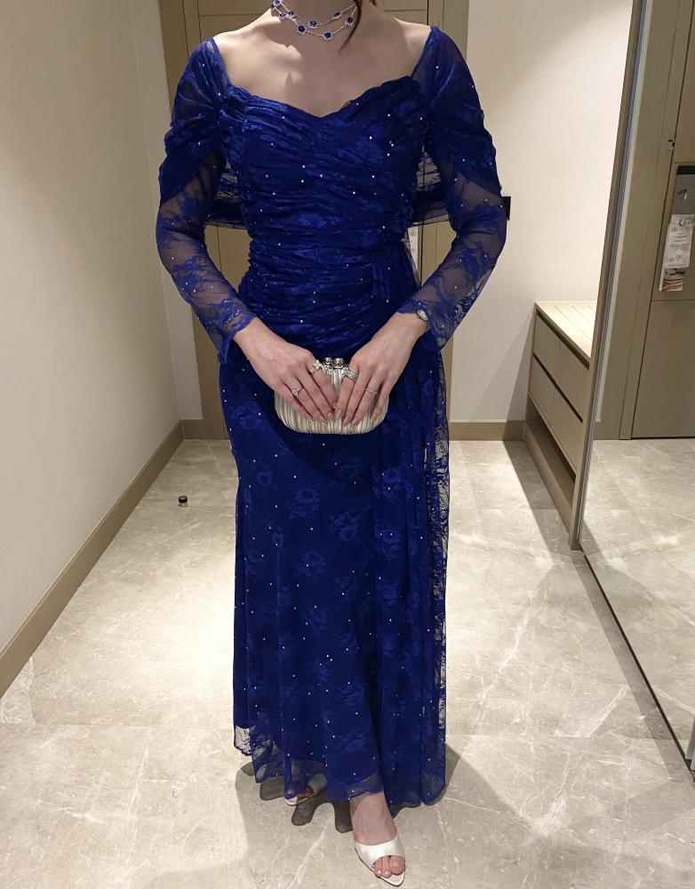 - الخامة واللون: فستان أزرق ناعم منسوج من الدانتيل الفاخر، بلون راقٍ وملفت يمنح البشرة توردًا صحيًا ووهجًا جذابًا.