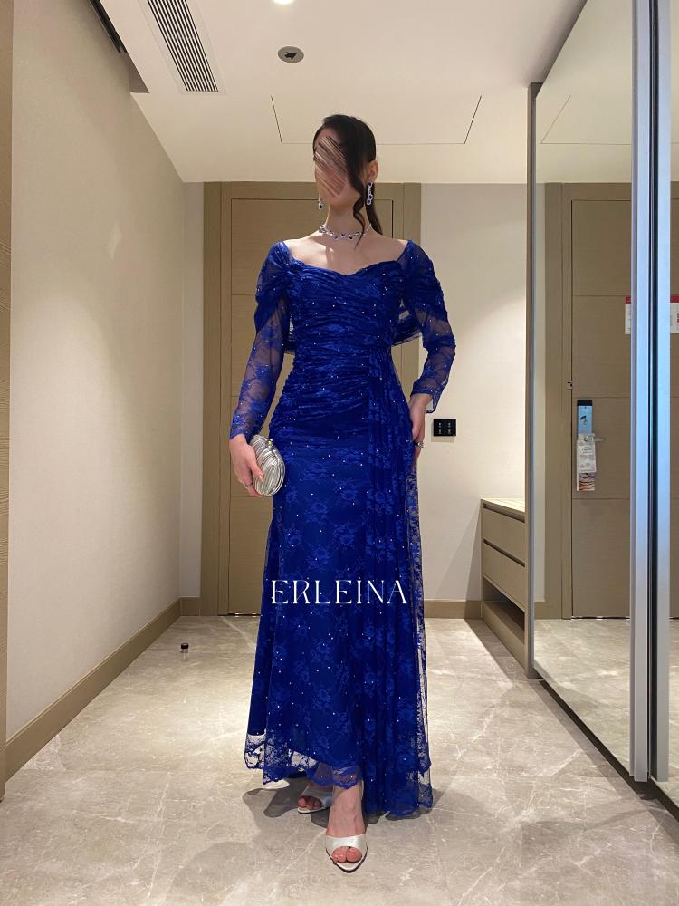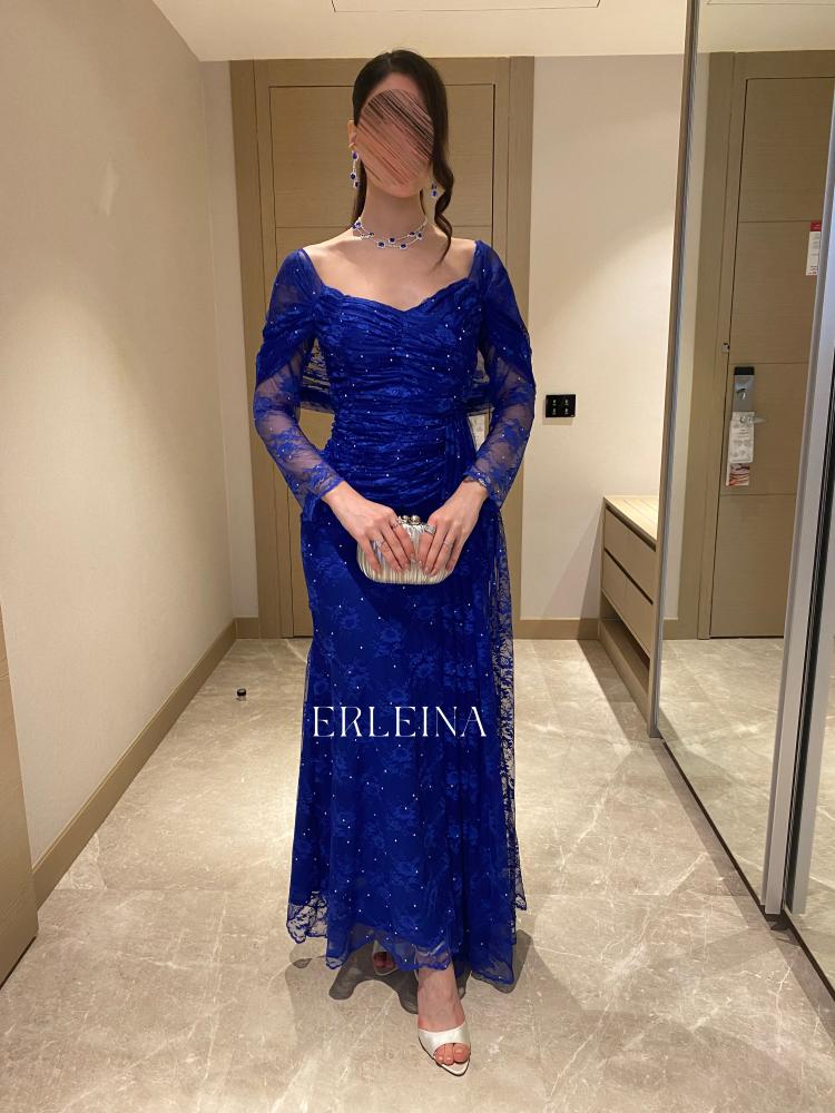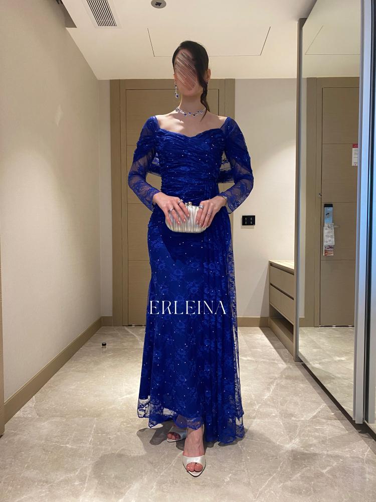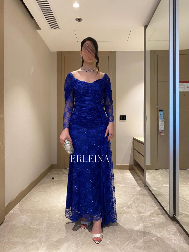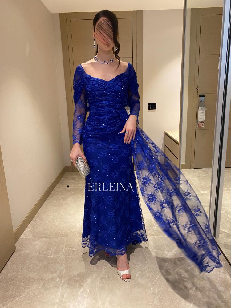- الخامة واللون: فستان أزرق ناعم منسوج من الدانتيل الفاخر، بلون راقٍ وملفت يمنح البشرة توردًا صحيًا ووهجًا جذابًا.