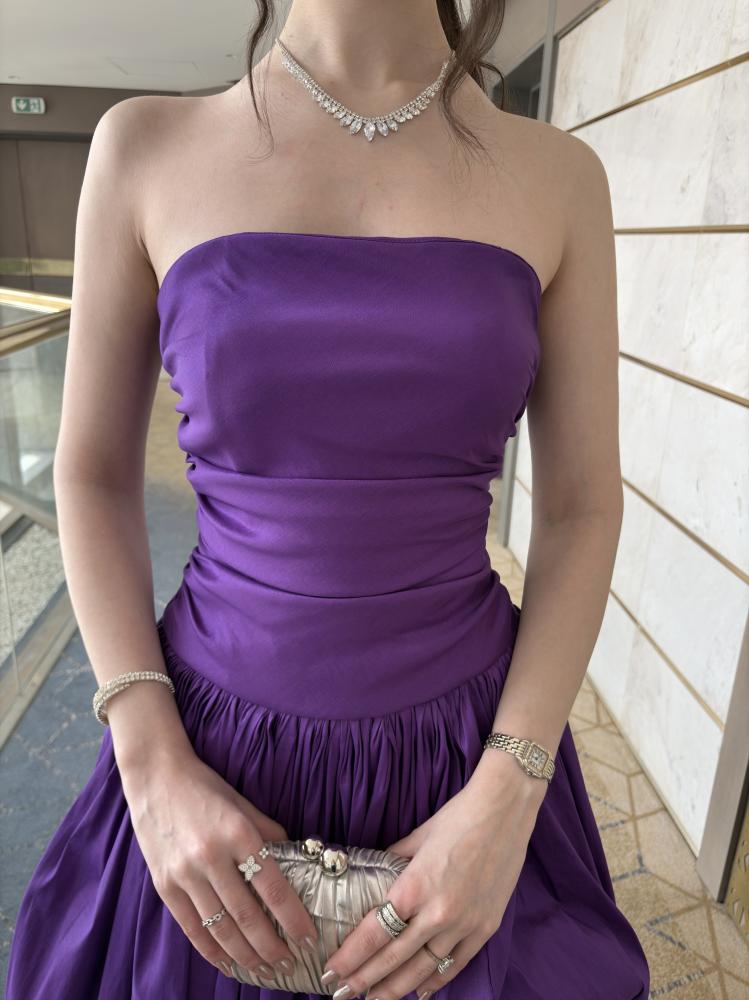 - الخامة واللون: فستان سهرة فخم من الشانطون الراقي بلون بنفسجي ملكي يُضفي وهجًا خاصًا على البشرة لتكوني محط الأنظار.