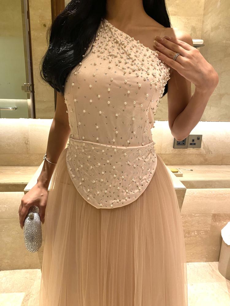 • الخامات والتزيين: فستان بينك فاتح منسوج بمزيج من التل الرقيق والتفته الفاخر، ومزين بعناية بحبات اللؤلؤ الراقي على الصدر.