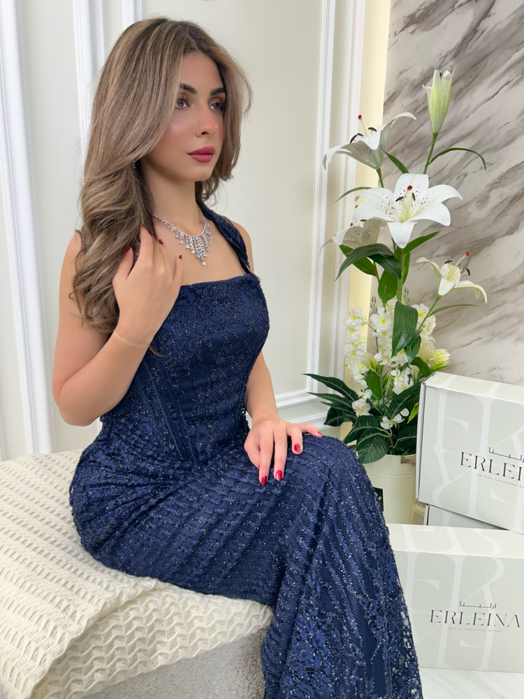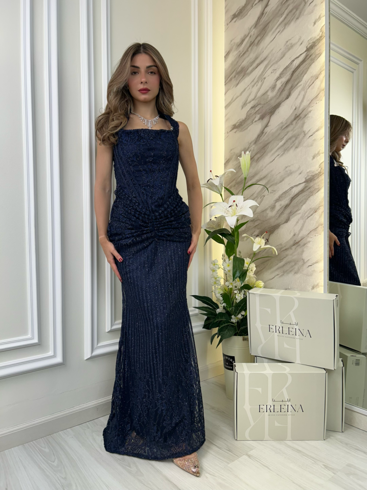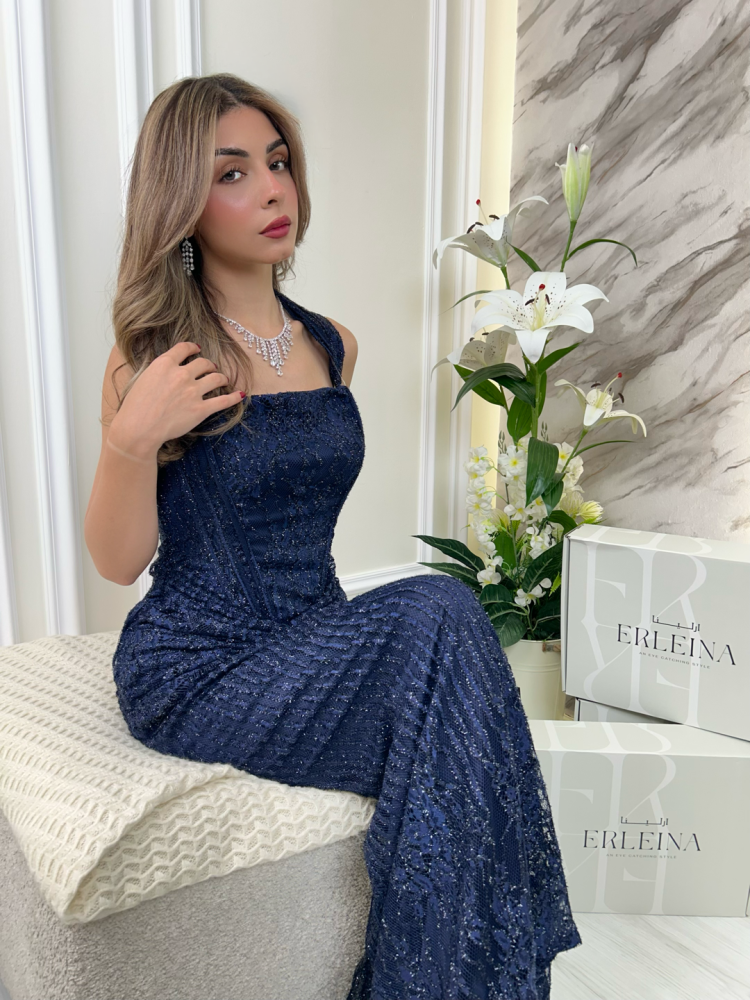 - الخامة واللون: فستان كحلي طويل منسوج من الدانتيل المترتر الفاخر بلون ملكي يضفي إشراقة صحية متوردة على بشرتك.