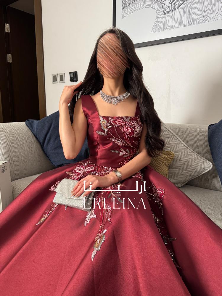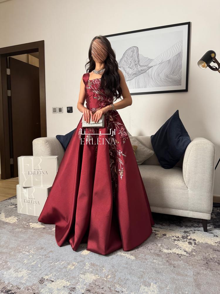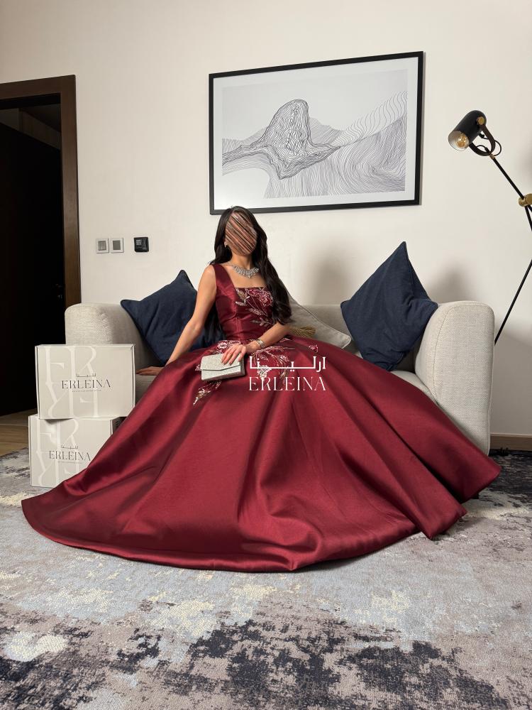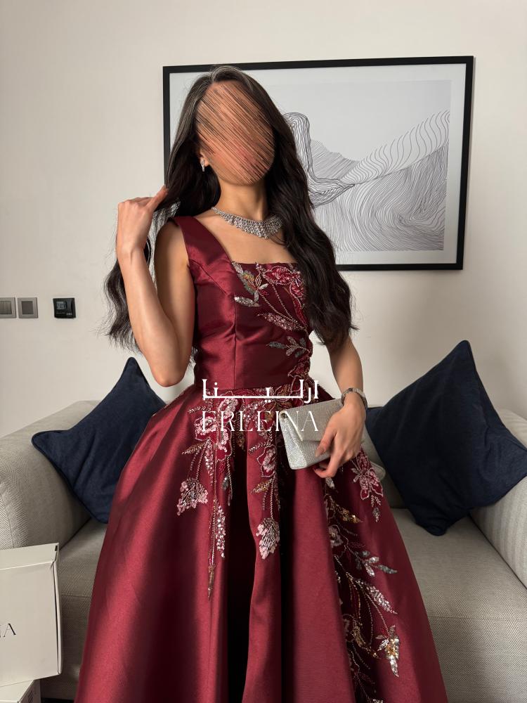 فستان سهرة عنابي بتطريز فاخر وربطة خلفية جذابة