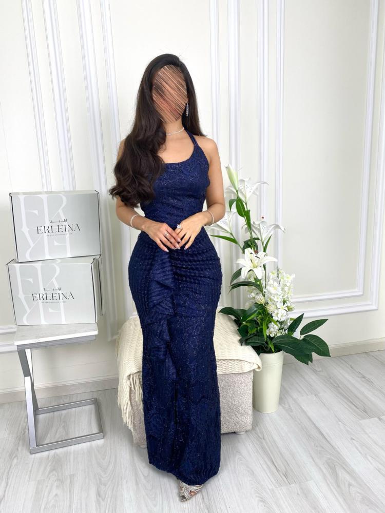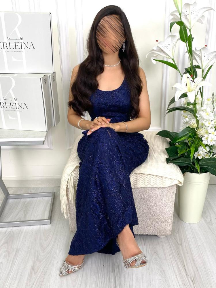 - الخامة واللون: فستان كحلي فخم منسوج من الدانتيل المترتر الراقي بلون ملكي عميق يعكس وهجًا صحيًا جذابًا على بشرتك.