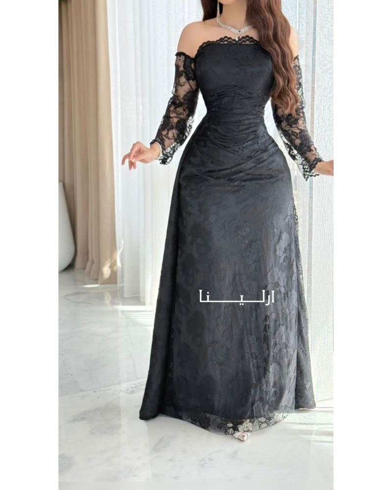 - فستان سهرة اسود ساحر منسوج من الدانتيل الفاخر بتصميم يبرز نعومتك وجمال لون بشرتك بفخامة ملفته.