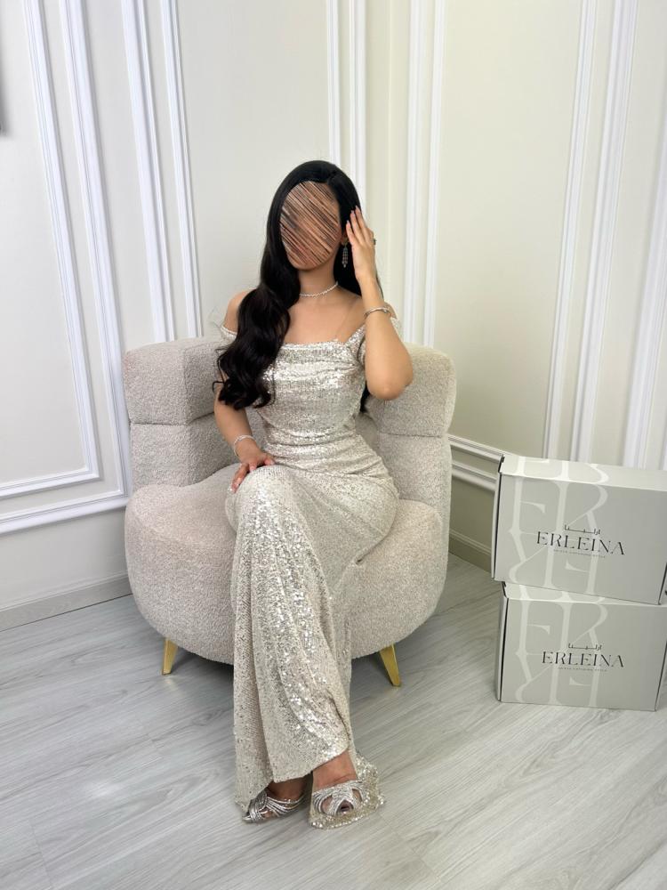 - الخامة واللون: فستان فضي لامع طويل منسوج بالكامل من قماش الترتر بوهجه الفاخر ليمنحك طلة كلاسيكية ملكية ساحرة.