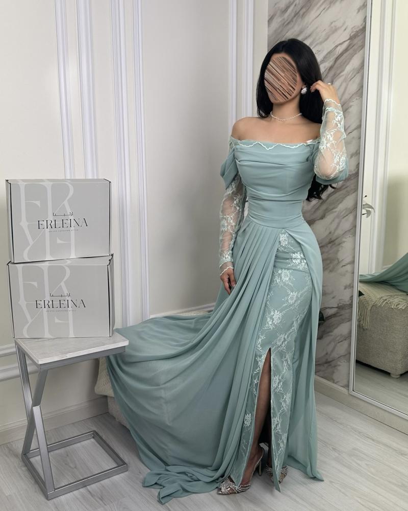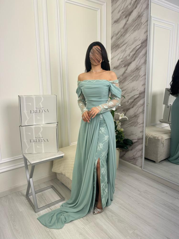 - الجزء العلوي والأكمام: تصميم أوف شولدر رقيق يبرز الكتفين بأنوثة، مع أكمام طويلة من الدانتيل الشفاف للمسة رقيقة تشع فخامة.