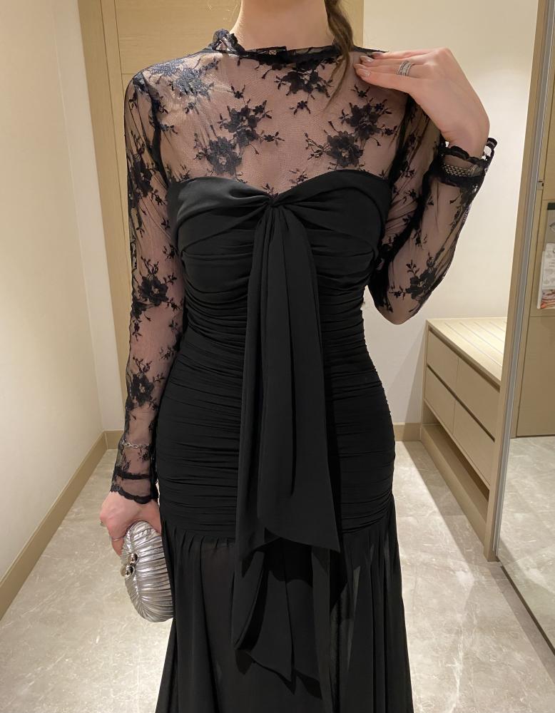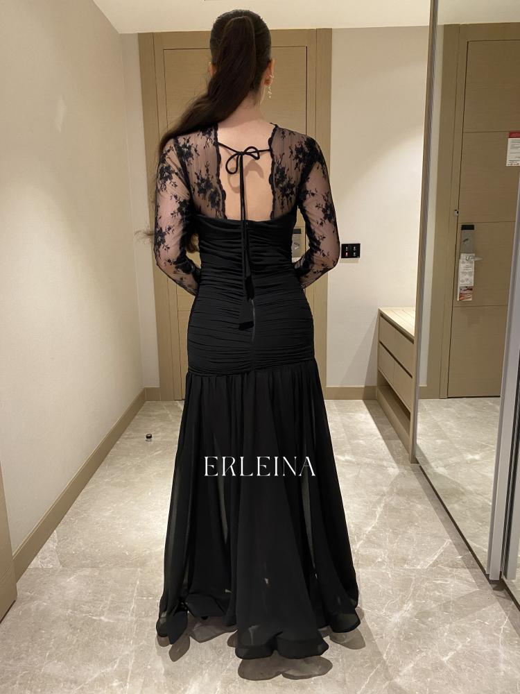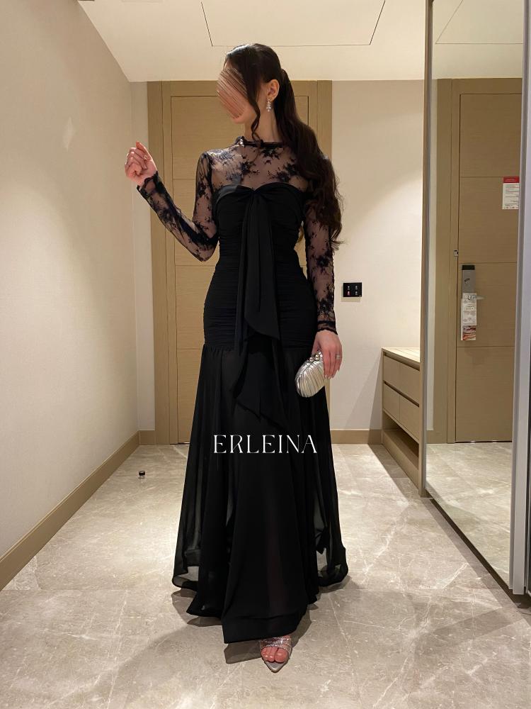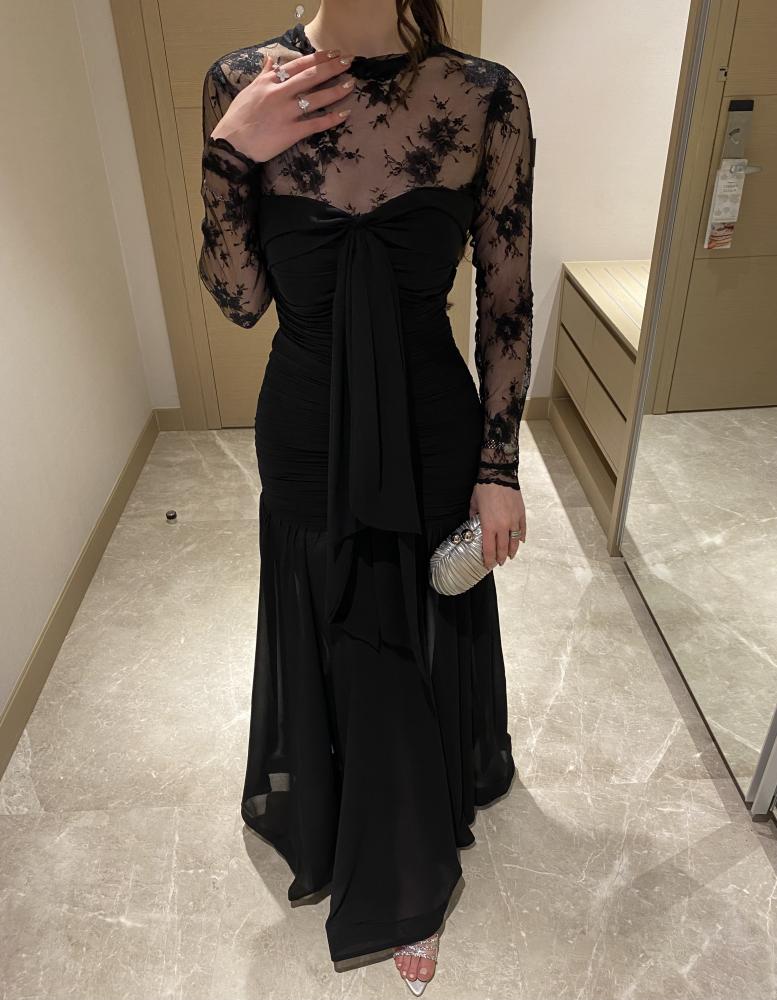 • الخامة واللون: فستان أسود أكمام طويلة منسوج بمزيج أنثوي ساحر من الشيفون الناعم والدانتيل الأنيق بلون ملكي آسر لطلة مثالية.