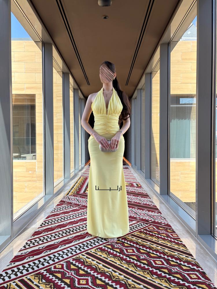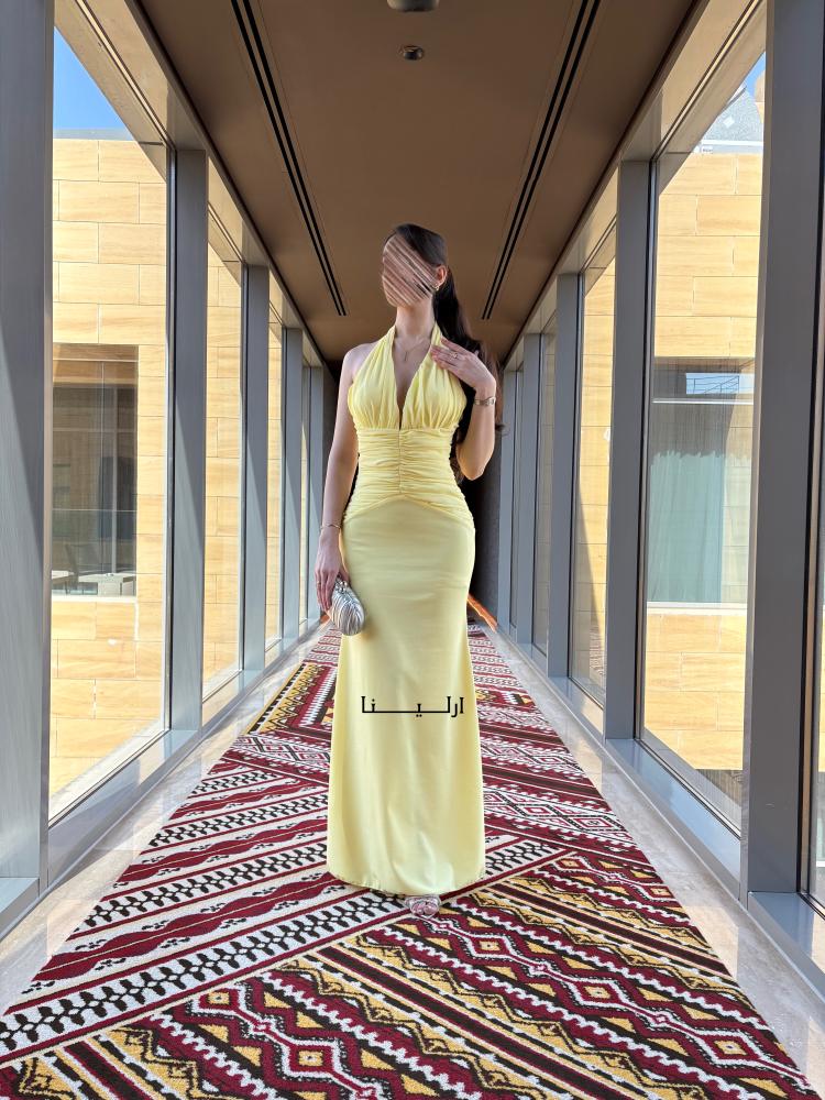 - الخامة واللون: فستان ناعم سهرة منسوج من قماش الباربي الراقي بلون أصفر مشرق يمنحك حضورًا مميزًا وملفتًا للانتباه.