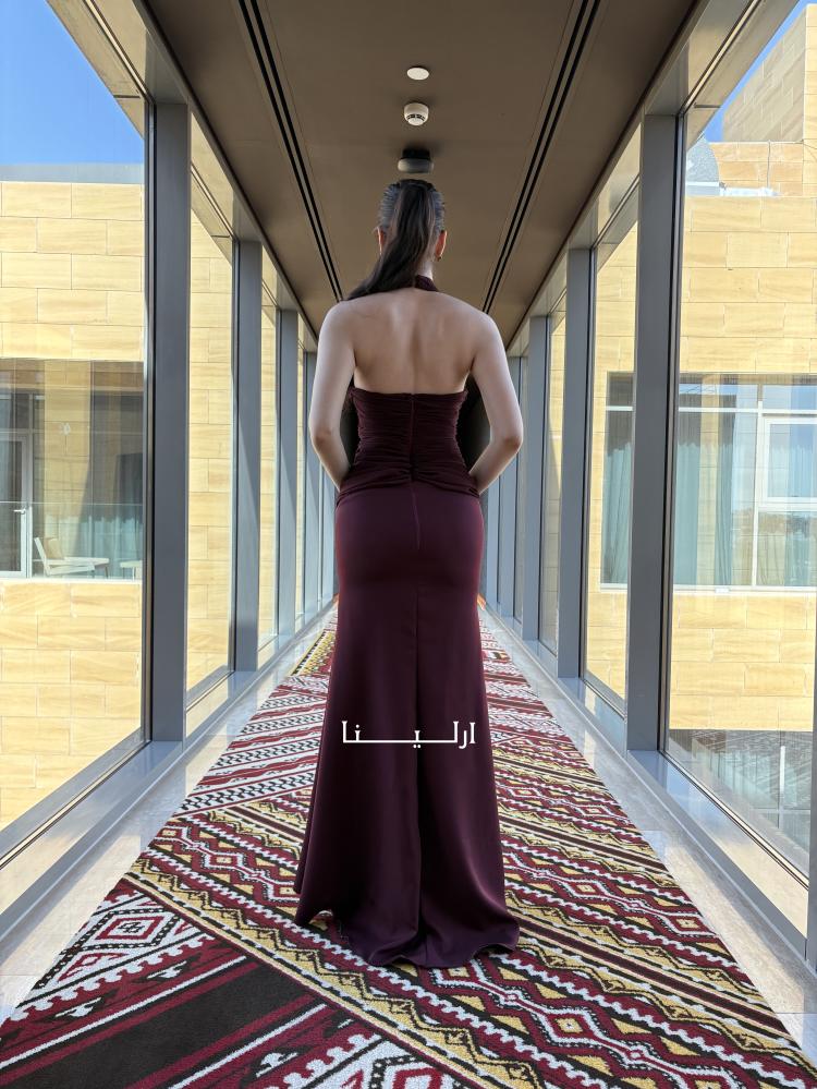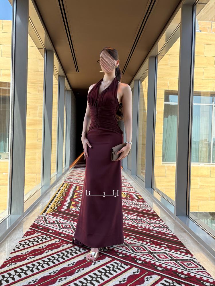 - الخامة واللون: فستان سهرة ناعم منسوج من قماش الباربي الراقي بلون عودي غامق يمنح بشرتك وهجًا وإشراقة صحية ملفتة.