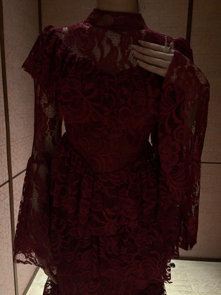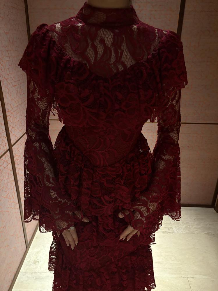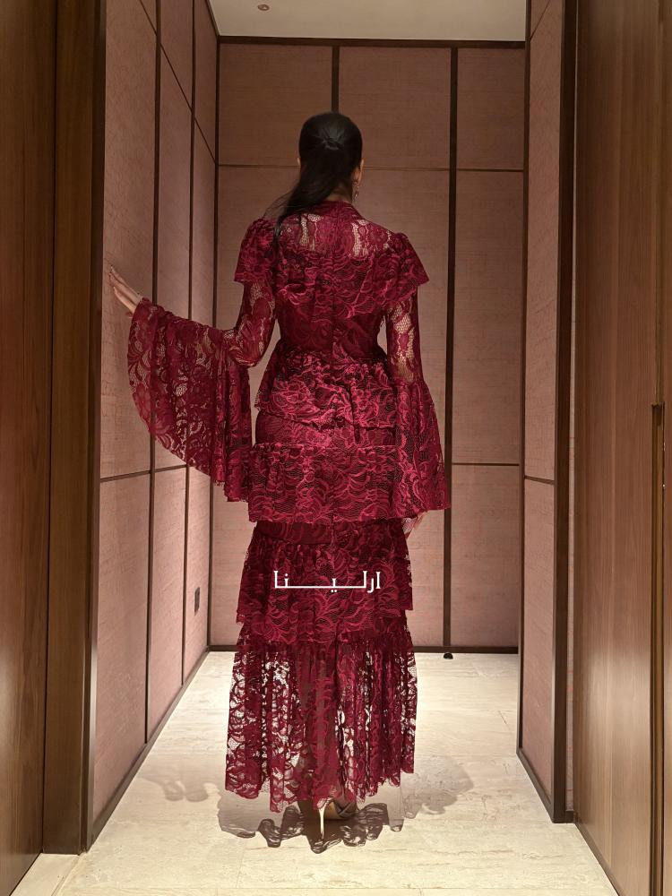 • الخامة واللون: فستان ناعم طويل من الدانتيل الأنيق بلون عودي غامق يمنح بشرتك إشراقة ووهجًا صحيًا آسرًا.