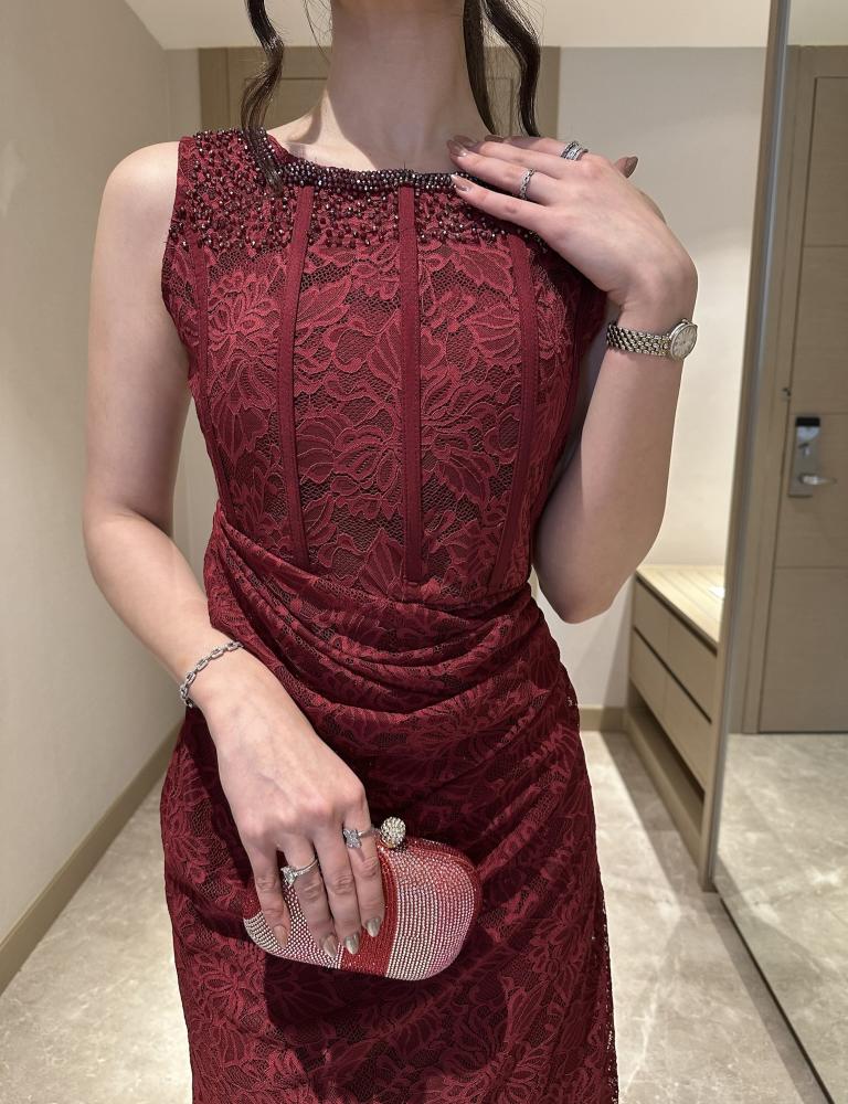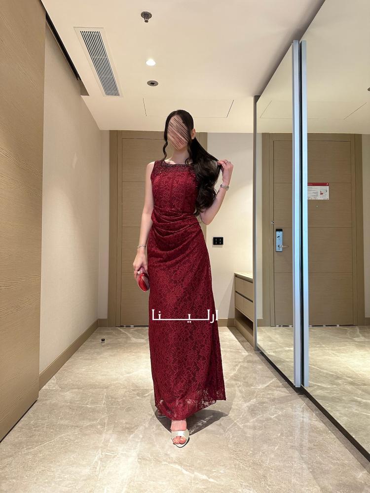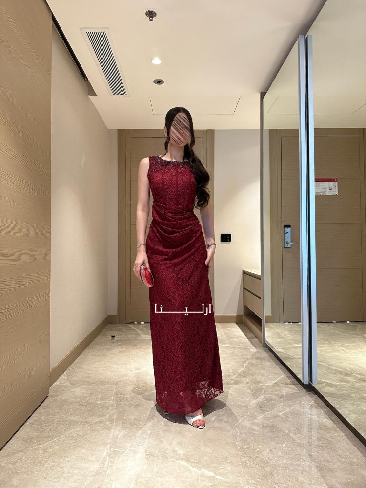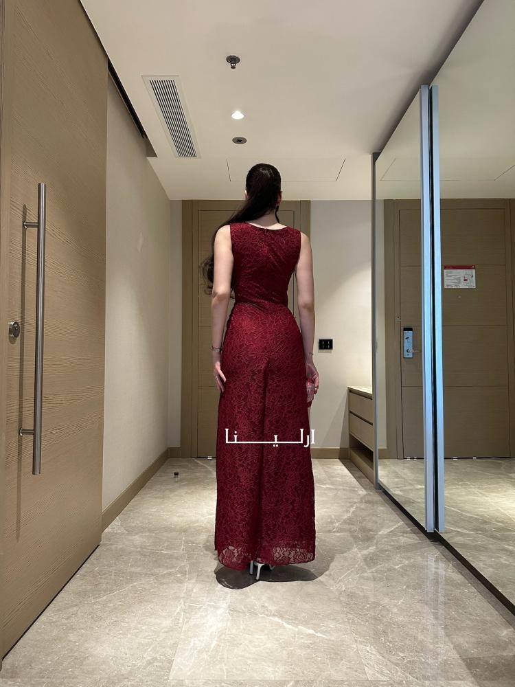 - الخامة واللون: فستان سهرة ناعم منسوج من الدانتيل الراقي بلون عودي عميق يمنح البشرة إشراقة صحية ووهجًا مميزًا