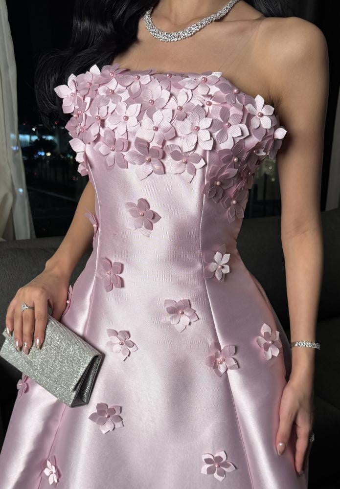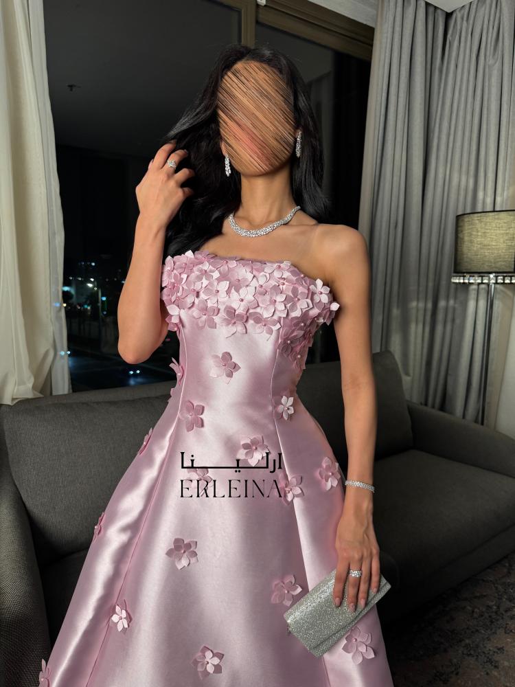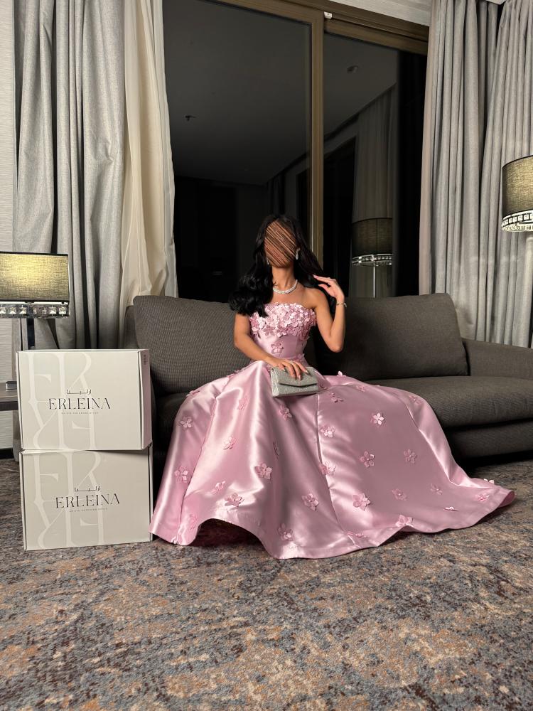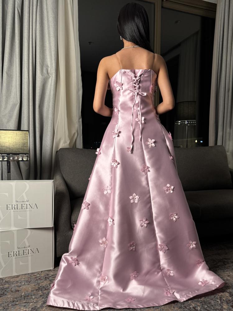 فستان وردي ناعم من الساتان بتفاصيل ثلاثية الأبعاد – أنوثة لا تُنسى