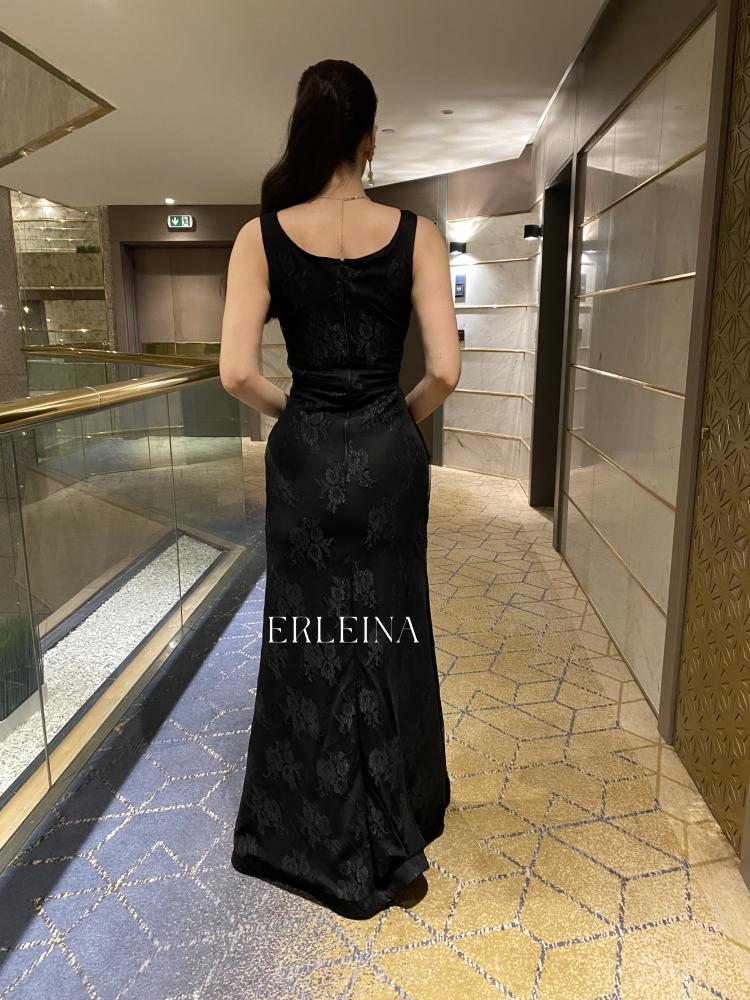 - الخامة واللون: فستان سهرة أسود فخم بتصميم لا يبهت من الدانتيل الفاخر، بلون ملكي ساحر يعكس وهج البشرة.