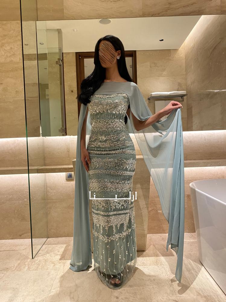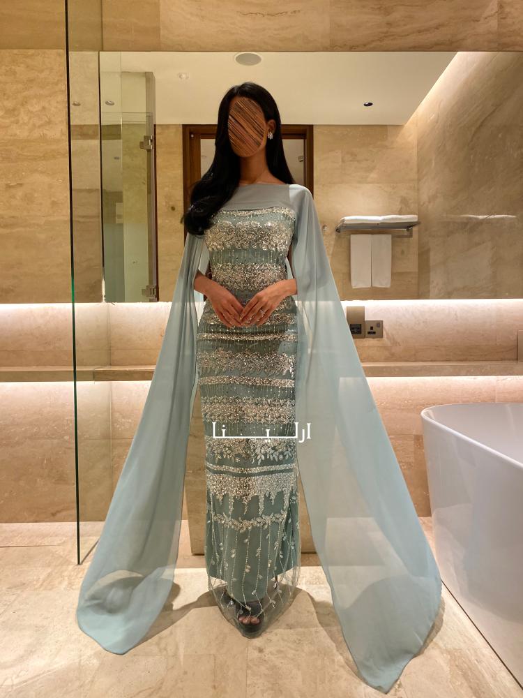 - الخامة واللون: قطعة ملكية ناعمة بتفاصيلها منسوجة من الشك الفاخر والشيفون الناعم بلون تيفاني رقيق لطلة حالمة.